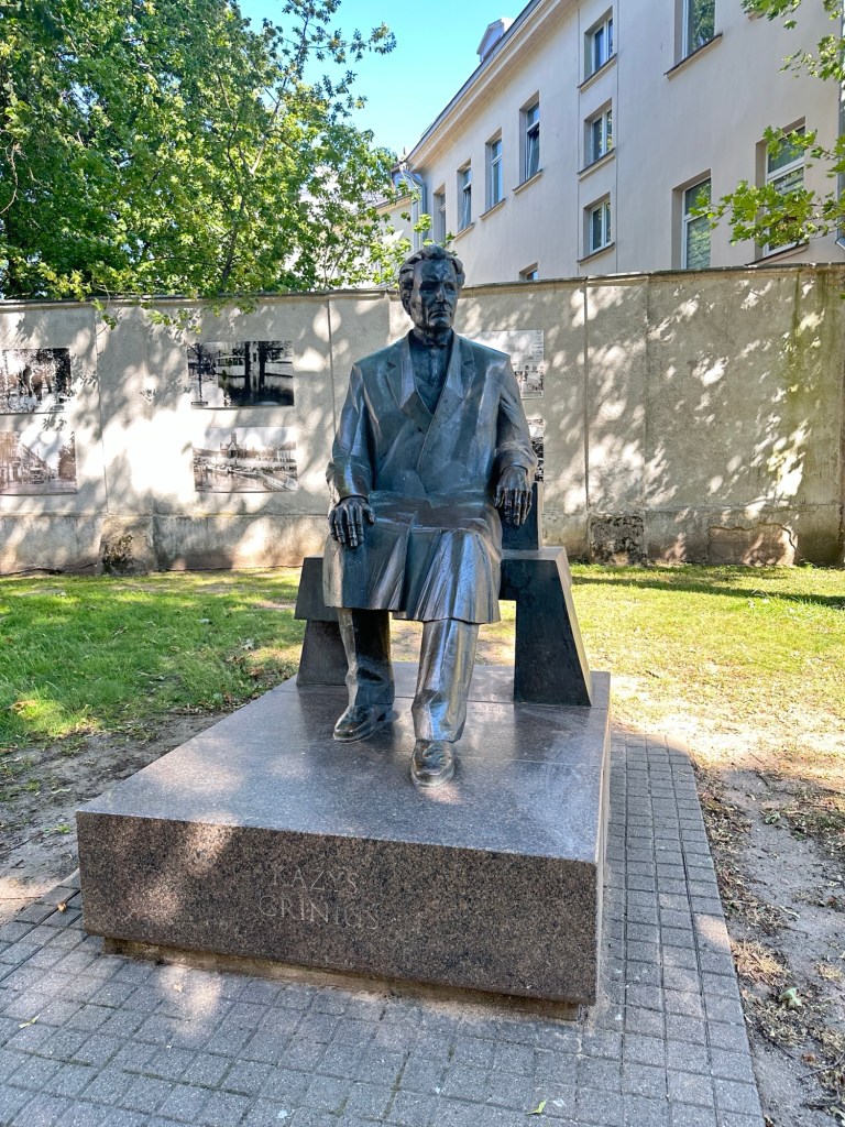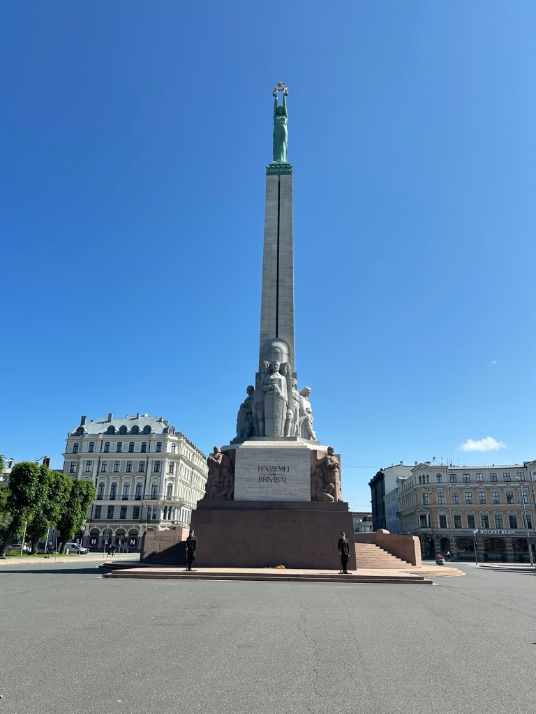 It was designed by the sculptor Karlis Zale. The slender granite column is topped by a female figure holding aloft three golden stars, which represent the three cultural regions of Latvia – Kurzeme, Vidzeme and Latgale. During the Soviet era the authorities banned people from laying flowers at the base of the monument and placed a statue of Lenin a short distance away. Our visit happened to coincide with the midday changing of the guards.