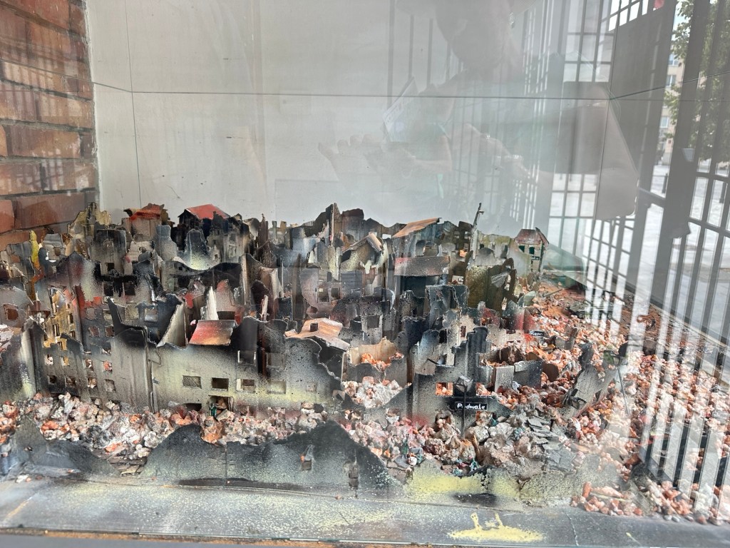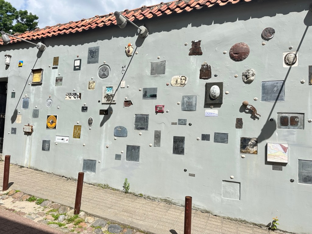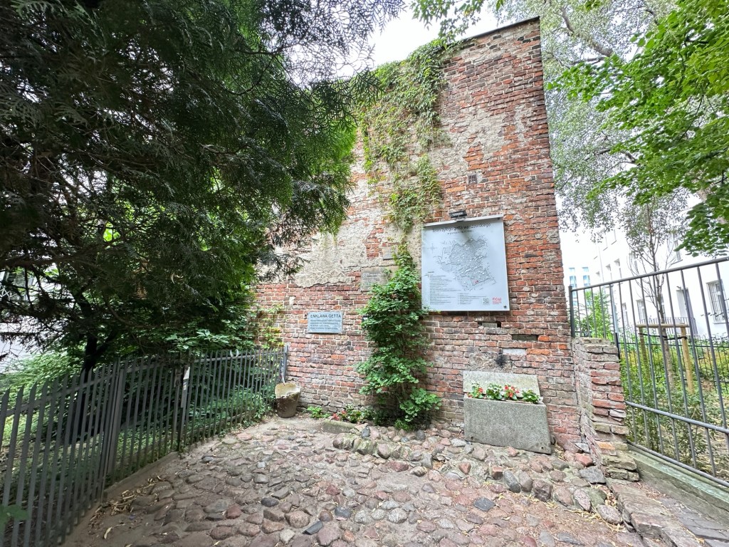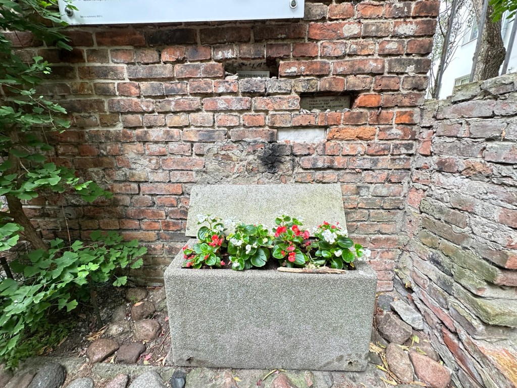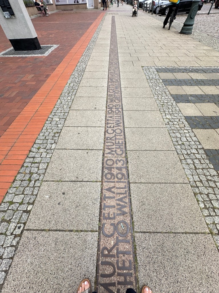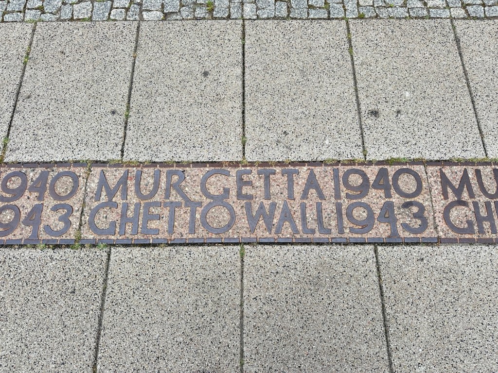 We saw two sections of the six remaining ghetto walls. Also where the foot bridge stood to move the Jews from one section to another. Dedication cast iron plates set in the pavement, mark the boundaries where the walls once stood. Very sobering.