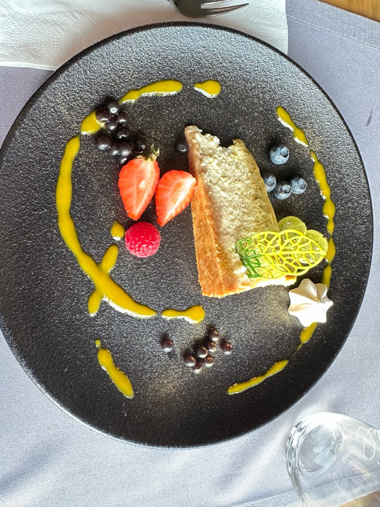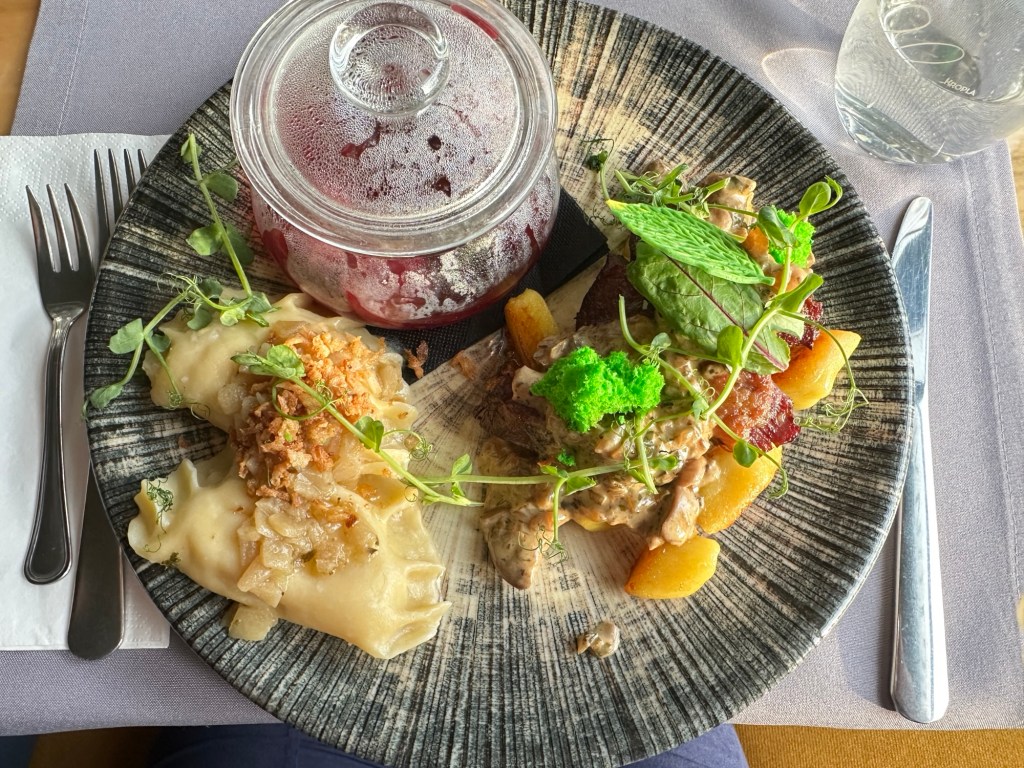 Some more sightseeing, before a three course meal at a lovely Polish restaurant on the waterfront. White borsch soup (no beetroot as I was expecting, fermented sourdough is the starter and creates a broth, sausage and potato added, giving a unique umami flavour – delicious), followed by wild boar with a rich mushroom sauce, sitting on potato gnocchi, accompanied with warm preserved beetroot and dumplings filled with cottage cheese. It was divine – the boar so tender! Surprisingly it was quite pink in colour. Bart, who was a chef, said that was normal. He was like a walking encyclopaedia when it came to food and its source. It was also great to hear of the Polish tradition food customs. We really didn’t think we could fit anything else in, when dessert was placed in front of us – Bart assured us it was only light! It was a cheesecake – the base was “old” bread, light ricotta cheese filling, and pistachio topping (it was baked) served with blueberries, strawberries and fresh sago – again divine. And it was light!