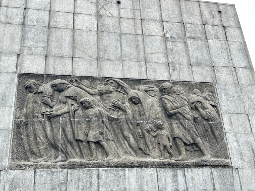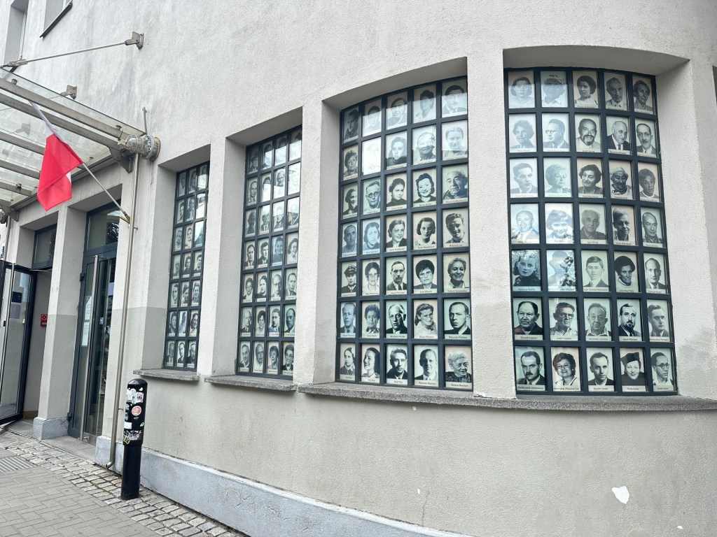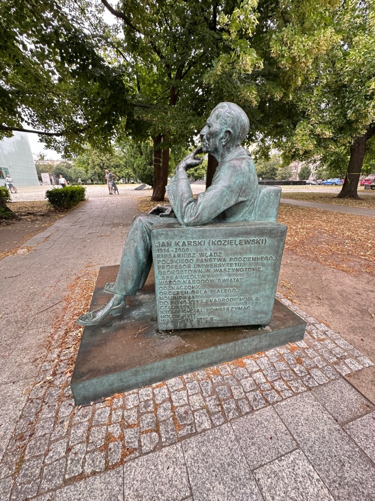 We stopped next at the POLIN Museum of History of Polish Jews. Here Martin gave us the information about the monuments and plaques in front of the museum. The Monument to the Ghetto Hero’s commemorates Jewish insurgents from the Warsaw Ghetto, which lasted from 19 April 1943 to 16 May 1943. On the eastern flank of the monument there is a relief entitled “March to the Holocaust” showing the suffering of women, the elderly and children led by the Nazis in an unknown direction.