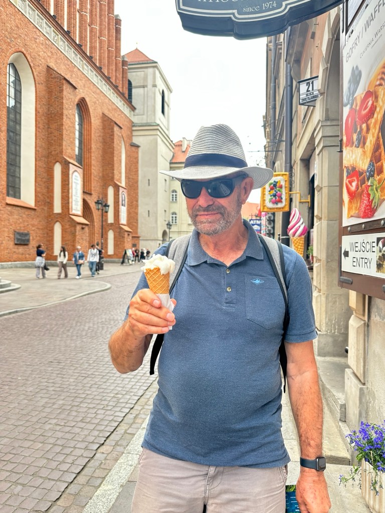 We had an enjoyable time walking through the Old Town, looking through churches and shops, reading the plaques. Many restaurants and cafes – obviously geared up for the tourists. Not too crowded. We had a traditional Polish meal at one of the restaurants- potato pancake (similar to Rosti) with goulash on top. Very filling. Also just had to try the Lody ice cream – there are vendors everywhere. They are an ice cream in a cone, and quite refreshing on a hot humid day.