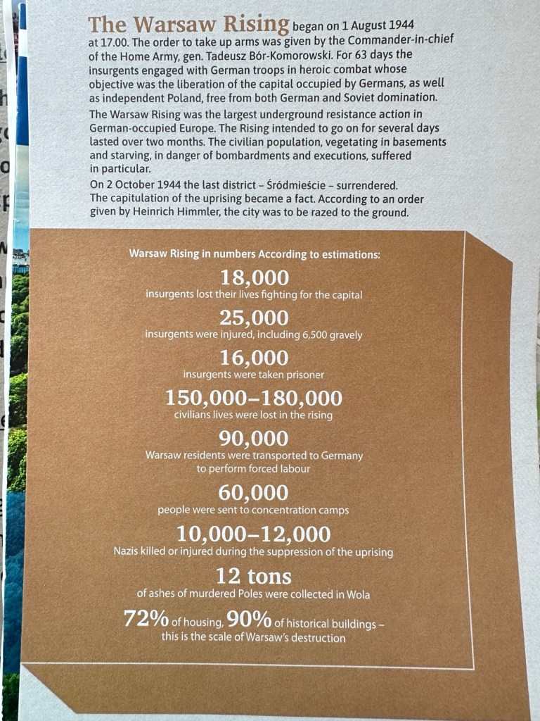 Raining today. We had a couple of hours before we needed to head to Central Station to catch the 12.52pm train to Krakow. That gave us time to walk 25 minutes (yes, in the rain) to the Polish Rising Museum. This exceptional museum, housed in a former tram power station and its surrounding grounds in the Wola District, traces the history of the city’s heroic but doomed uprising against the German occupation in 1944. It was a very moving exhibition, but showed the determination and resilience of the Polish people to be freed from German rule. The Poles lost their hard fought battle, and Hitler ordered that all Varsovians be murdered. Those that escaped and survived were not allowed to talk about it for 60 years while they were under Russian control. Hard to comprehend. The Monument of the Little Insurgent is now inside the museum – a bronze statue commemorating the children who lost their lives in the Warsaw Rising. We had limited time there because we had a train to catch, but you could easily spend the best part of a day there.