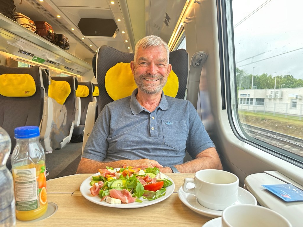 Frank had booked first class tickets which included lunch. We had bought salad rolls to have on the train not realising, so just had the light option of prosciutto and blue cheese salad to go with the rolls. It was a relaxing smooth ride – very comfortable. We will know about the meal for our next trip!