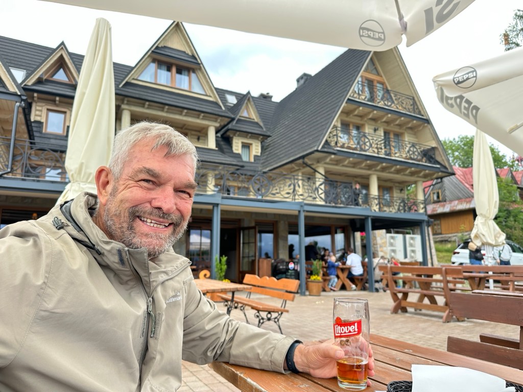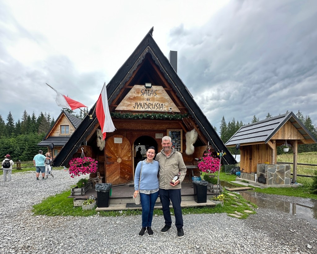 Another big day trip today, but not such an early start. We got picked up at 8.45am for the day trip to Zakopane. Ninety minutes later and we were in the Tatra Mountains, the highest mountain range in the Carpathian Mountains, and very close to Slovakia. We stopped at a traditional mountain hut and the guide, who was a bit of a character, had us trying the Highlander cheese plus sampling three flavours of vodka. He even had us wearing skirts and hats, and then a competition to do the Polish vodka drinking custom. Frank won that (mind you, he was the only participant), but he did walk away with a bottle of raspberry vodka for his effort! Not a bad start to the day! Oscypek is a traditional Polish scalded-smoked cheese, manufactured from raw sheep’s milk – it was delicious served with a cranberry relish.