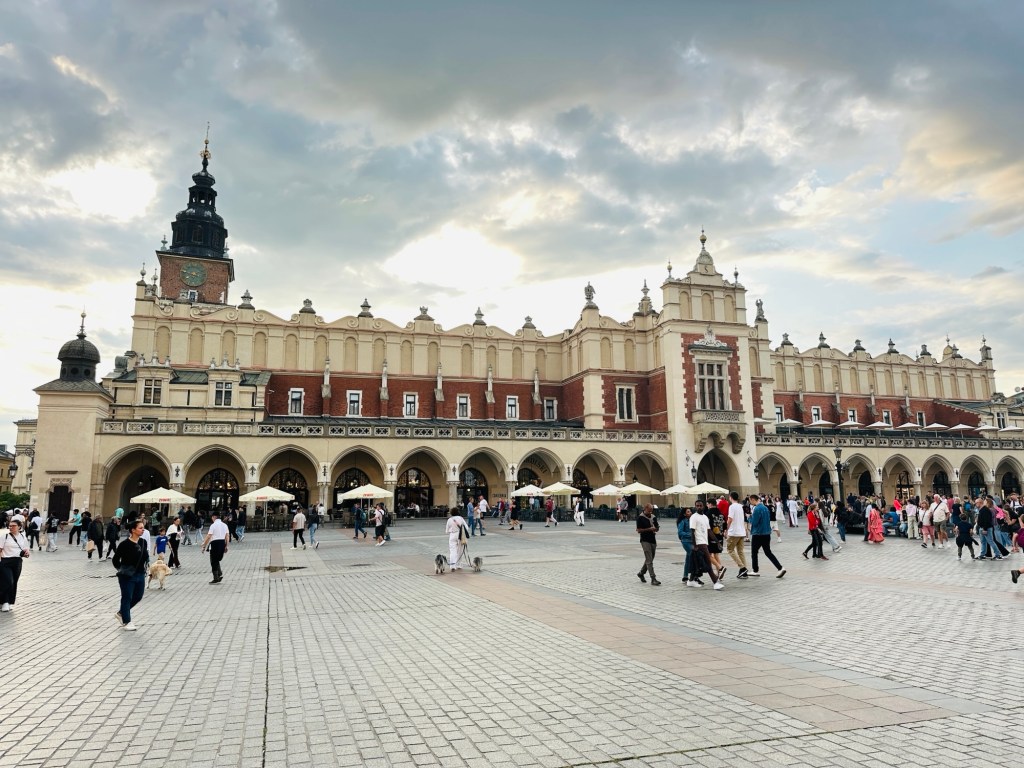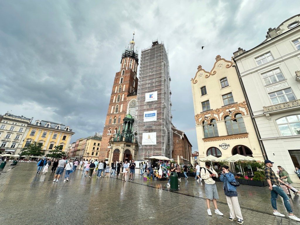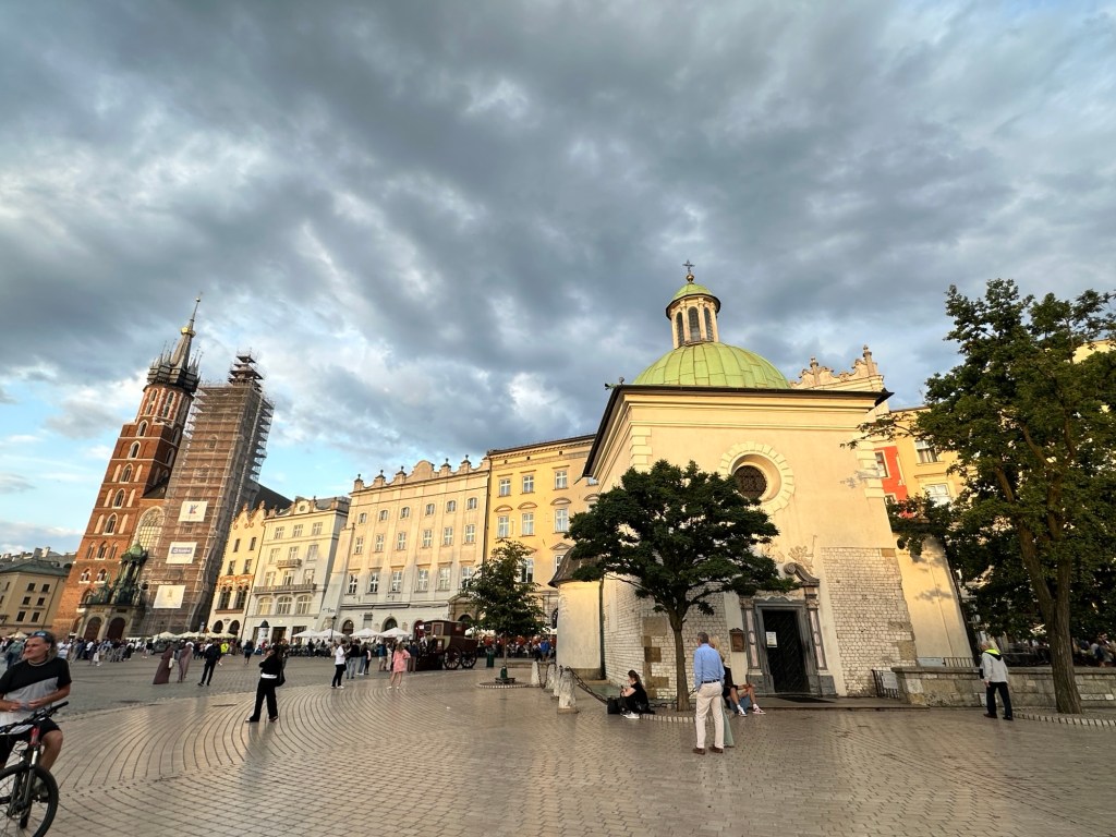 Market Square is said to be the largest town square in Europe. In summer, street cafés and restaurants remain open here until the early hours, with flower stalls, street musicians, and artists all adding to the lively atmosphere. Besides the Cloth Hall, two other notable buildings stand in the square: the green-domed church of St. Adalbert and the City Hall Tower, a relic of the original Gothic town hall.