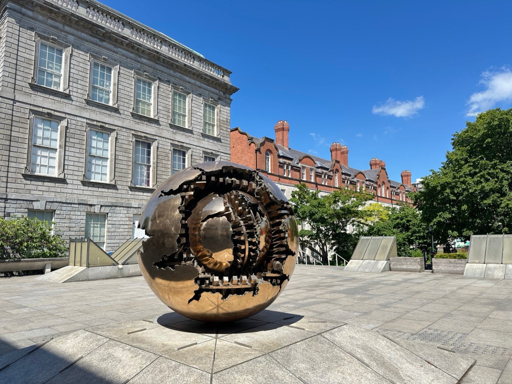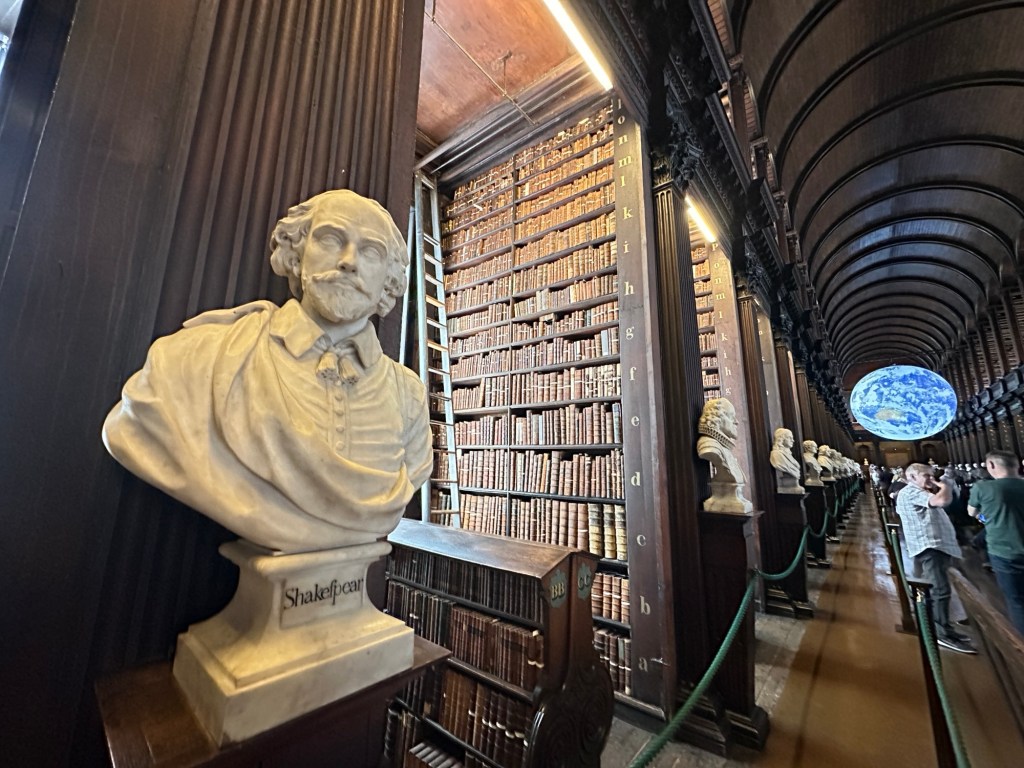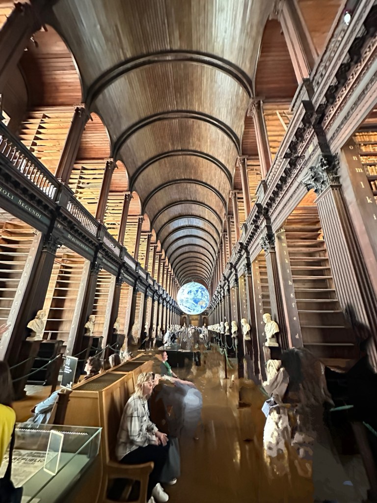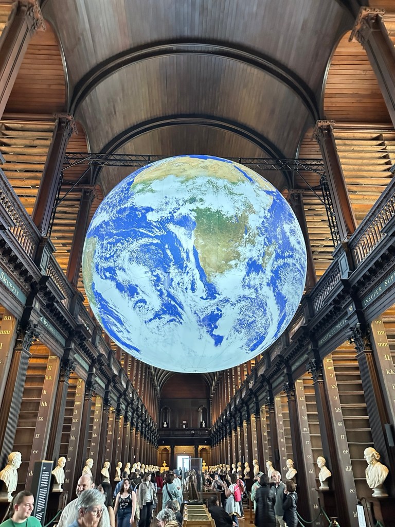 We had paid to go to The Book of Kells Experience. The Book of Kells is a masterpiece of medieval art. It is a superbly decorated, handwritten copy of the story of the life of Jesus Christ set out in the Gospels of Mathew, Mark, Luke and John. The Book of Kells was written on vellum (calfskin), in Latin, close to the year 800 AD. It was fascinating to see how this book was made all those years ago. The highlight was going upstairs to visit the Long Room which was designated as a legal deposit library entitled to a copy of every printed work published in the British Isles. Also there, was Gaia, an artwork by Luke Jerram, designed to highlight the beauty and the fragility of the earth.