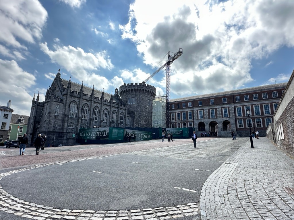 Next a walk around Dublin Castle. We walked around the grounds, enjoying the Dubh Linn Gardens. The castle was built by the dark pool (“Dubh Linn”) which gave Dublin its name. This pool lies on the lower course of the River Poddle before its confluence with the River Liffey; when the castle was built, the Liffey was much wider, and the castle was effectively defended by both rivers. The Poddle today runs under the complex.