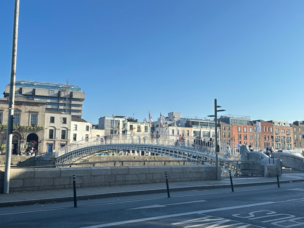 Touch down at 9am into Dublin airport. We’re here! A very quick transit through immigration. Only issue was that Frank’s suitcase had been damaged – a broken handle. So off to the baggage complaints counter and a claim lodged. Usually it’s my bag that takes a beating, but Frank’s was the target this time. He always says it’s because mine is overpacked , but his only weighed in at 22 kgs, so we can dispel that theory! It was a short uber ride, but still took 30 minutes because of the traffic, to our hotel, Staycity Aparthotels. It was too early to check in, so we left our bags, and set out to explore.
