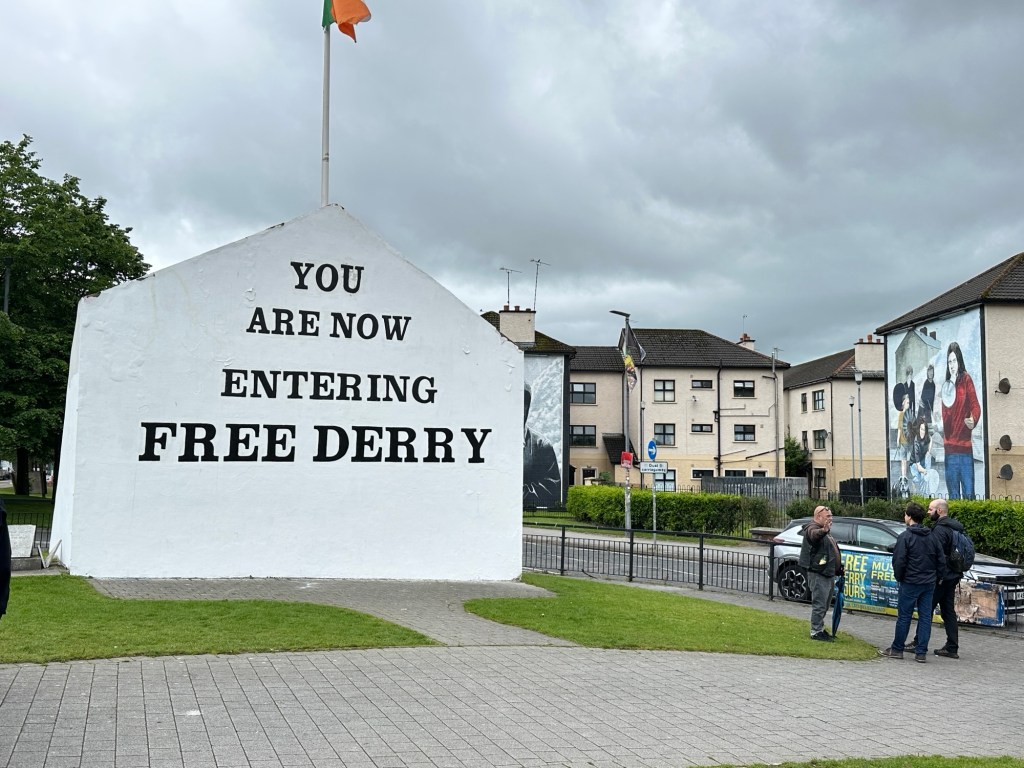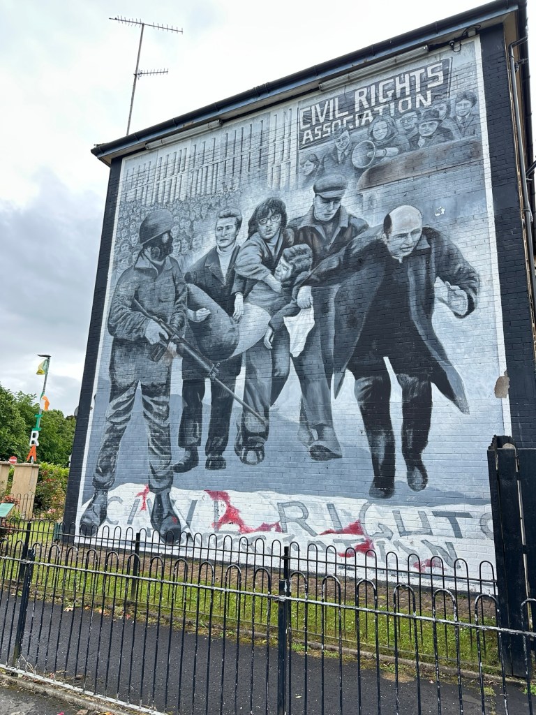 Made it to Derry/ Londonderry (the Catholics call it Derry, the Protestants call it Londonderry ) , just in time to start the Derry City Troubles Bogside walking tour at 2pm. John, our guide, started with Derry’s history of the cause to fight for Civil Rights for Derry Catholics. Catholics were not allowed to live behind the walled city – they had to live in the Bogside, and were denied basic civil rights such as voting, housing and employment. This led to significant freedom marches, and unrest between the British Army and local Catholics.