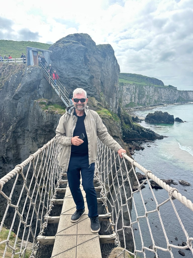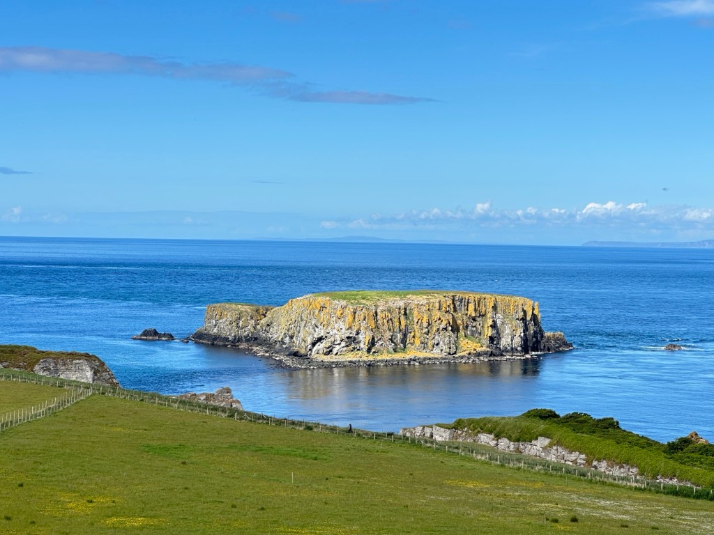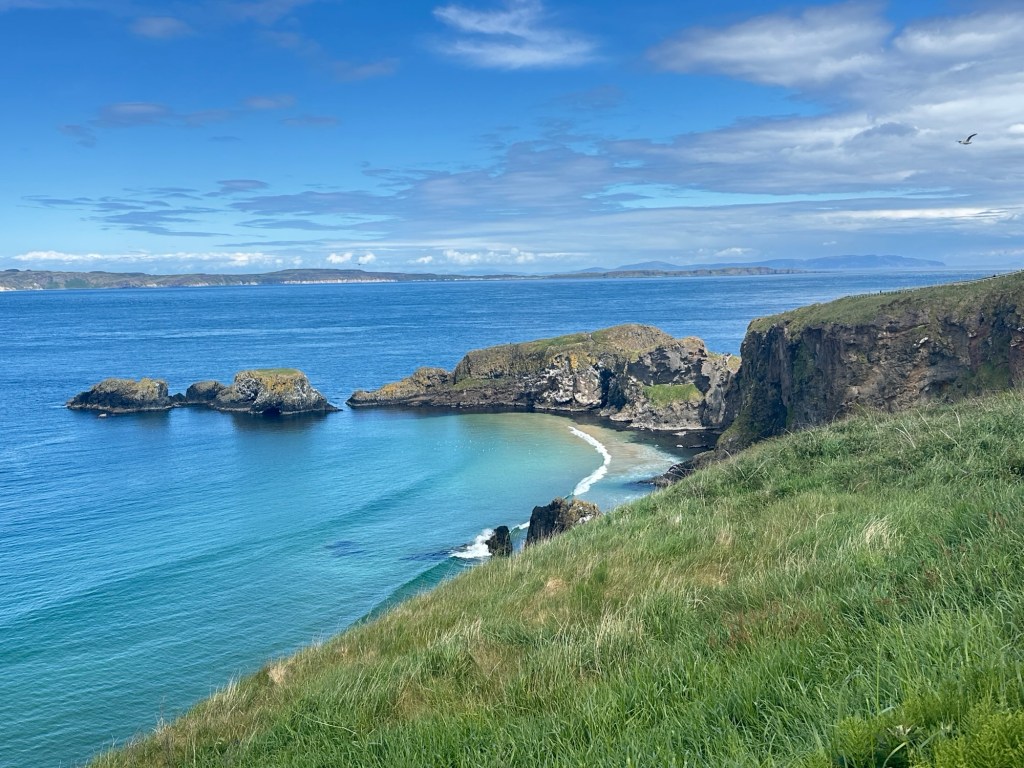 Fifteen minutes later did we were at another spectacular attraction, Carrick-a-Rede. Here we walked for 20 minutes, then came to the rope bridge. Traditionally, fishermen erected the bridge to Carrick-a-Rede Island over a chasm of 23m-deep and 20m-wide, to harvest salmon from their nets. In the distance we could see the Mull of Kintyre in Scotland. It’s a bit scary crossing the bridge, but nowhere near as bad as the one we crossed in Yukon, Alaska. More stunning scenery on the island. And best of all, no rain, just vibrant blue skies.