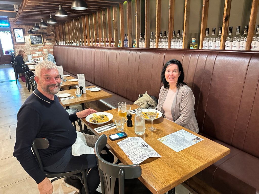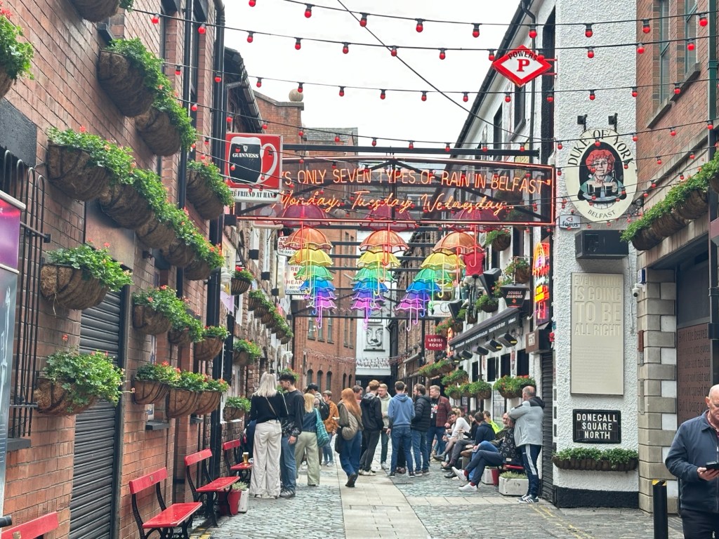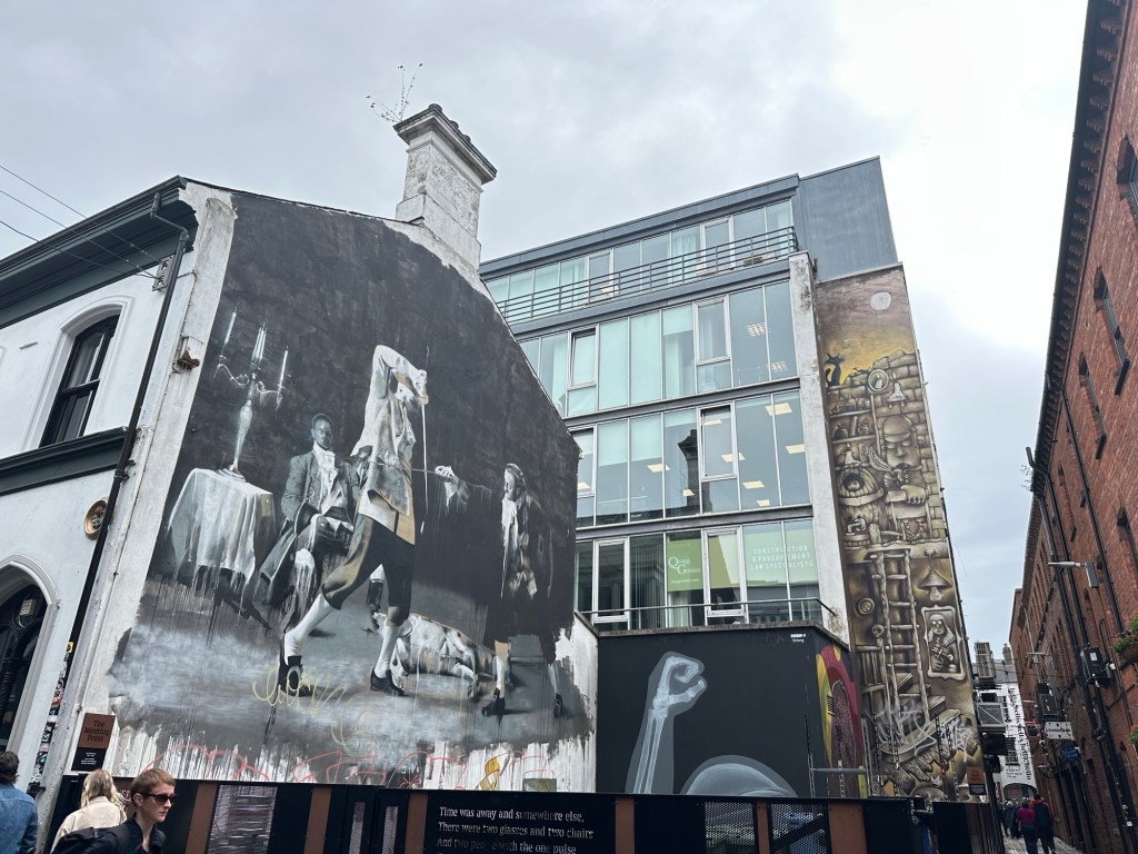 Brian left us at Cathedral Quarter (there are actually 8 quarters, with possibly a new one soon!), so we had a wander around this area- some interesting bars with quirky names (The Thirsty Goat and The Spicy Onion) plus many restaurants. Because we hadn’t really stopped for lunch, we had the early pre theatre dinner – at Forty-four restaurant. A delicious two course meal for £24. And very filling! This quarter had some great murals and artworks to look at. Time for some retail therapy before heading back to the hotel.
