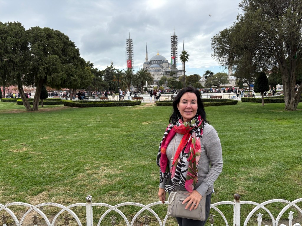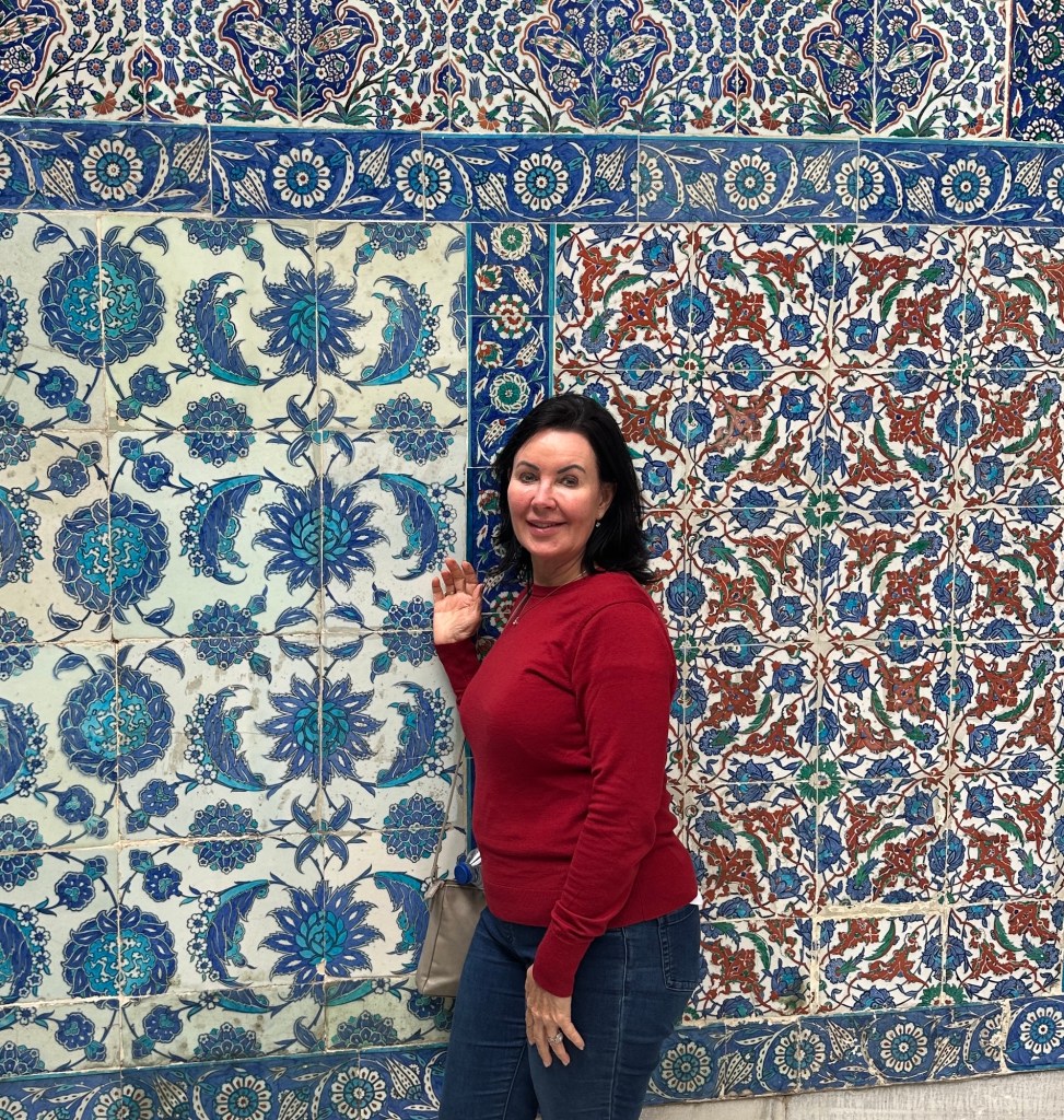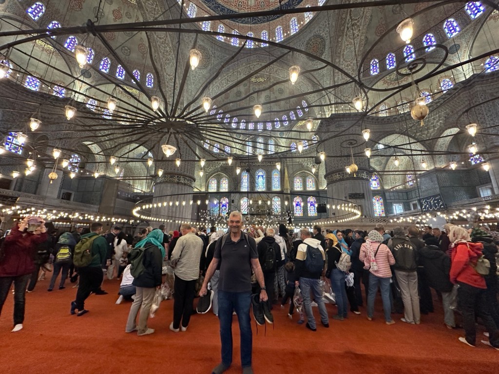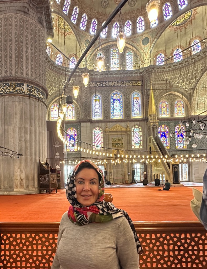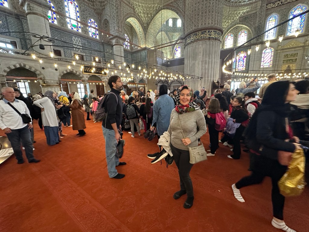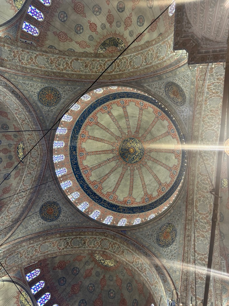 Today’s first visit was to the Blue Mosque, which was a 25 minute walk from where we were staying. Two years ago when we were in Istanbul, the Blue Mosque was being renovated- the inside has been completed, however the outside is still a work in progress. So we were there along with twenty thousand other tourists, or so it seemed. The Blue Mosque, officially the Sultan Ahmed Mosque, is an Ottoman-era historical imperial mosque, constructed between 1609 and 1617 during the rule of Ahmed I. It is known for its six minarets, many domes, and its blue interior. The mosque is also known as the Blue Mosque because of the abundance of blue Iznik tiles on its walls. The mosque’s walls are adorned with 21,043 stunning tiles.It really is beautiful inside.