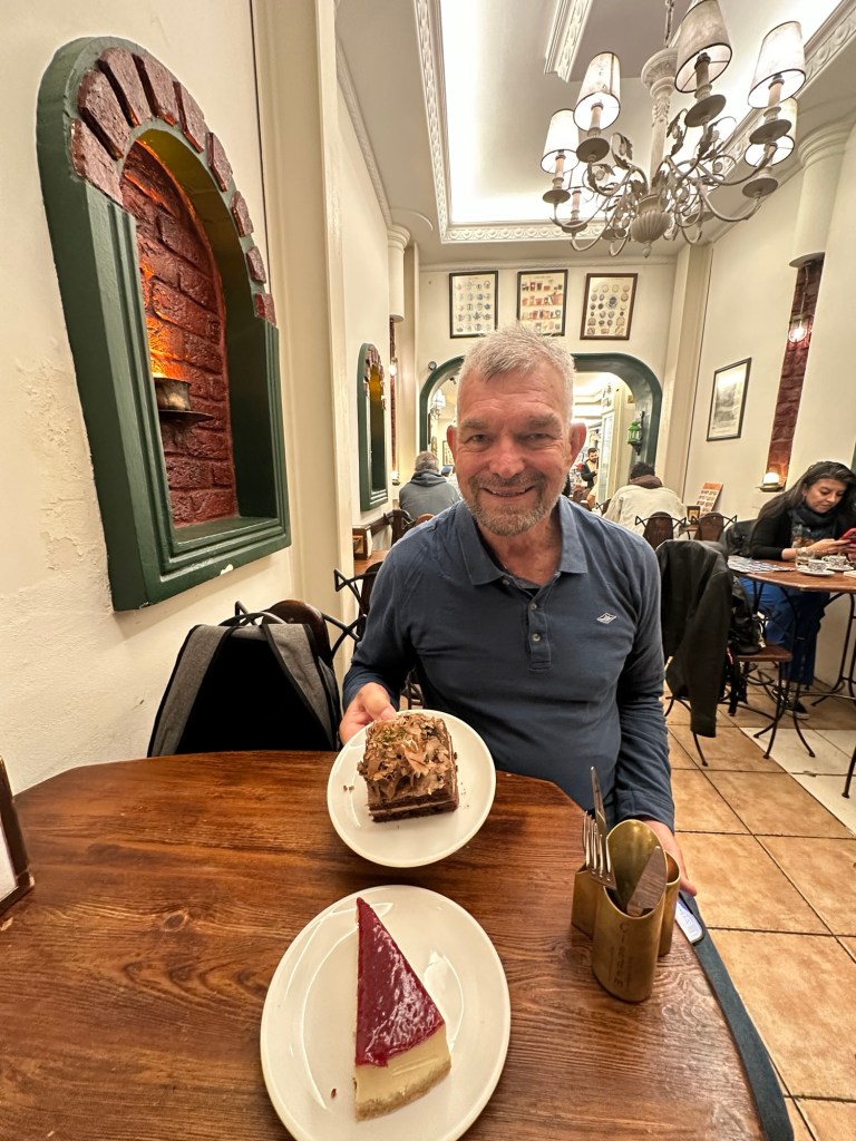 Time for a coffee – we treated ourselves to some decadent sweets – a huge piece of chocolate and cream layered cake for Frank, raspberry cheesecake for me. I note we have reverted to European prices – $9 for coffee in the tourist hot spots!