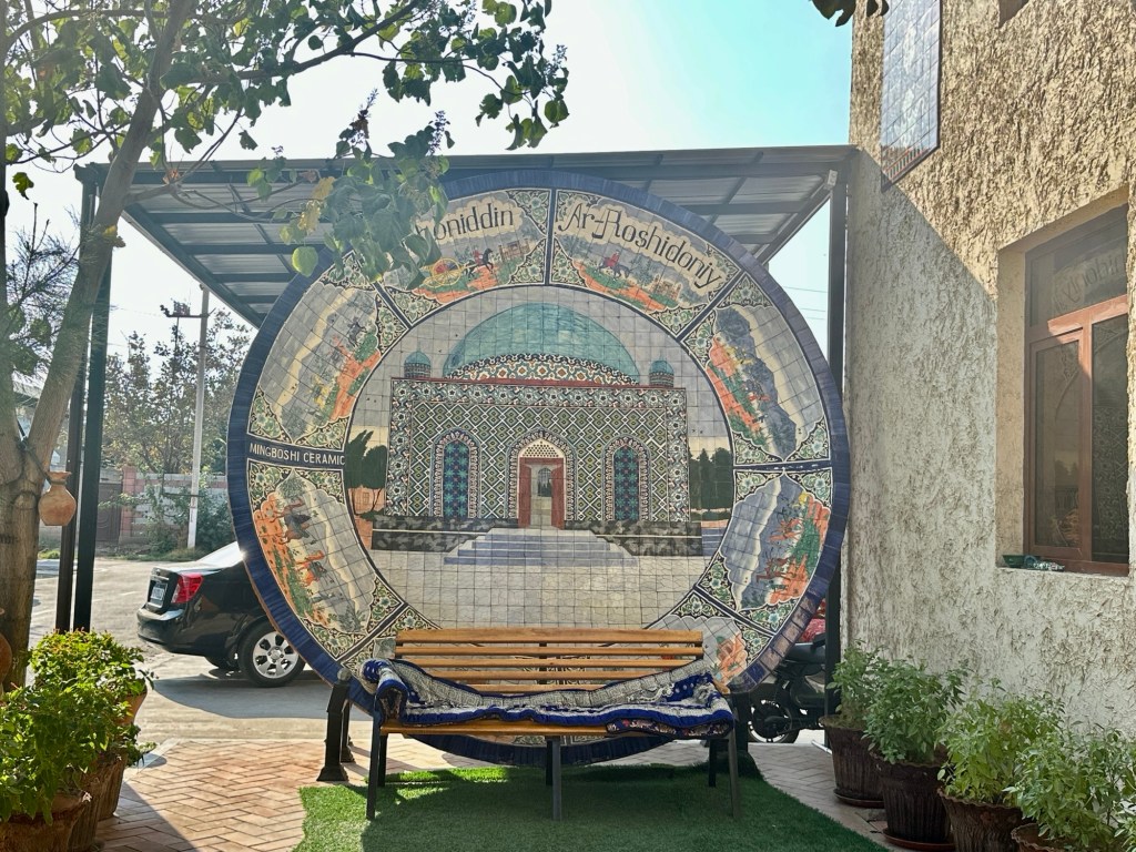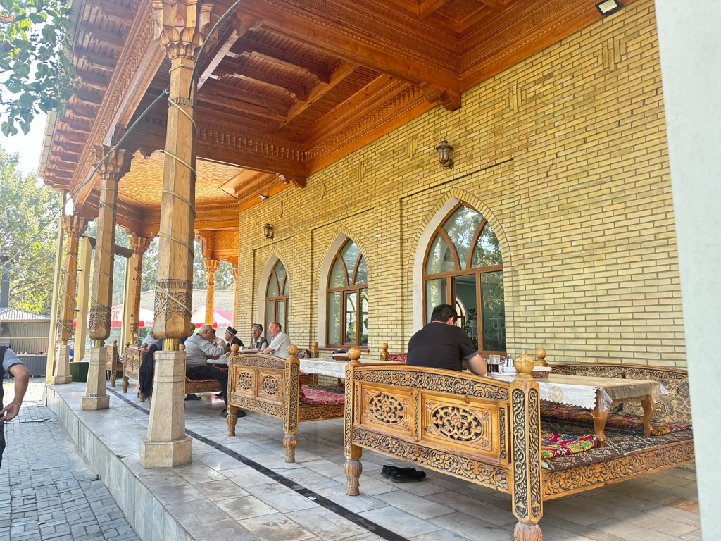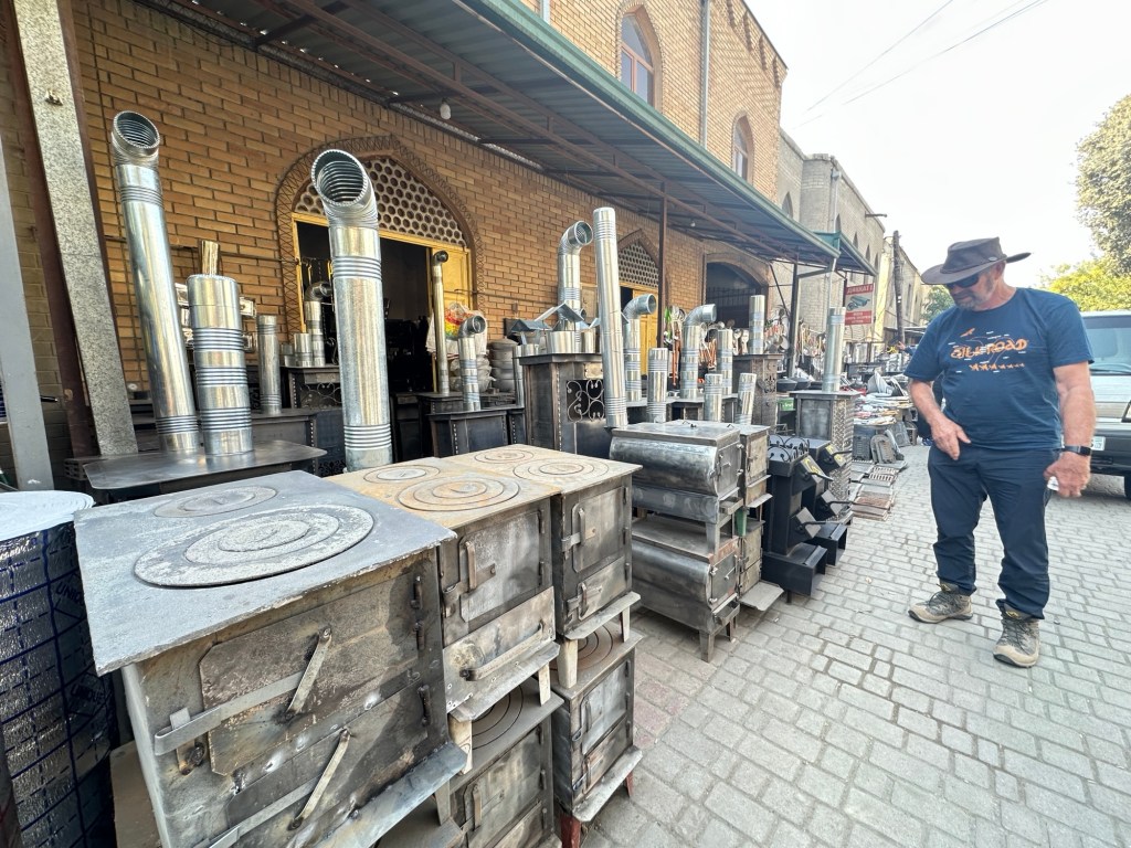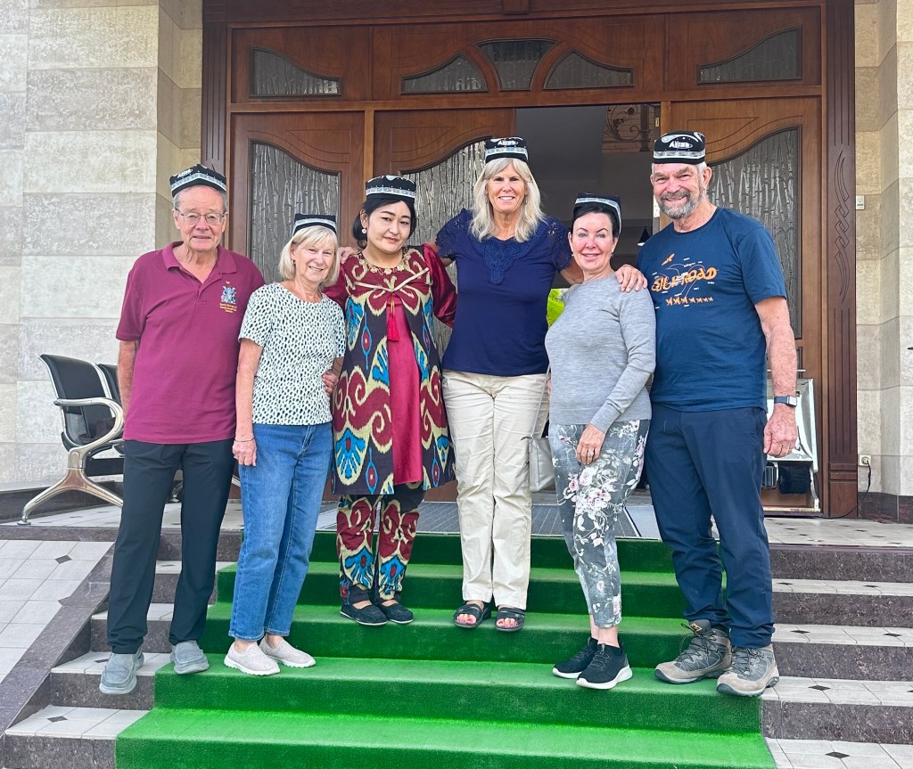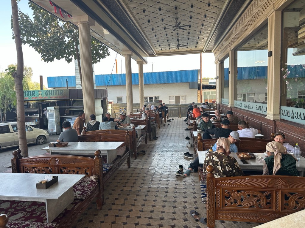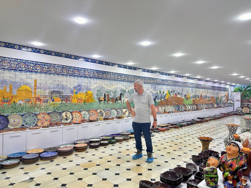 Another hour’s drive to Margilan where we had one night at the Atlas Hotel. Found a nice Turkish restaurant for dinner, after we’d walked for miles down one street that had 50 men’s shops! Had a yummy dinner.