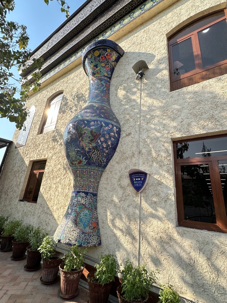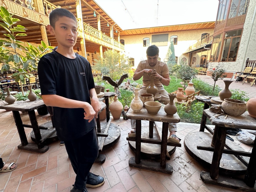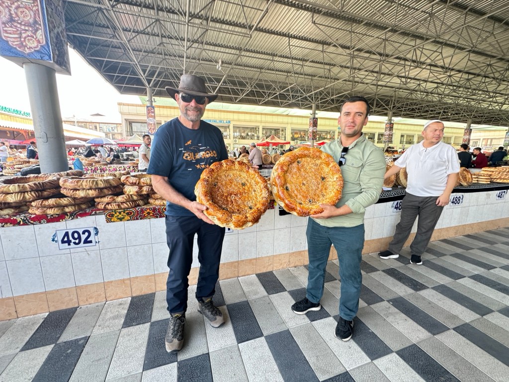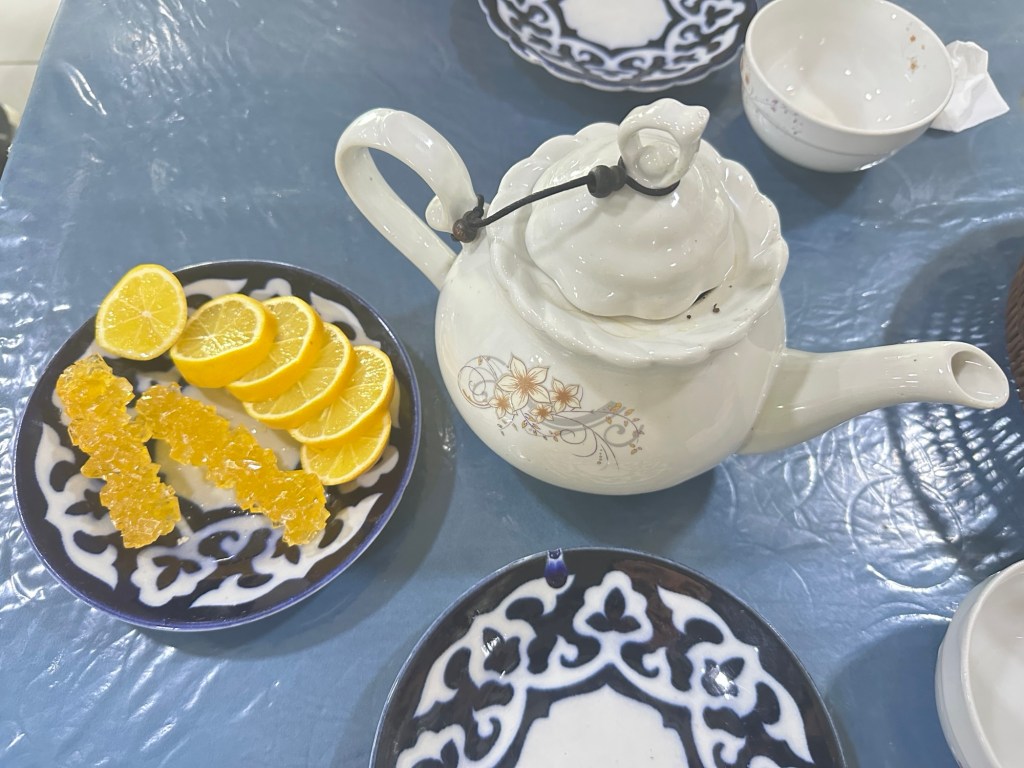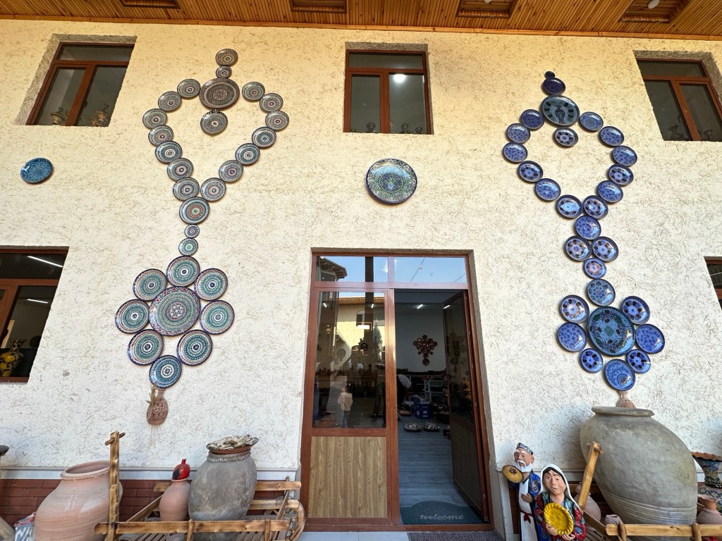 Another hour’s drive to Margilan where we had one night at the Atlas Hotel. Found a nice Turkish restaurant for dinner, after we’d walked for miles down one street that had 50 men’s shops! Had a yummy dinner.