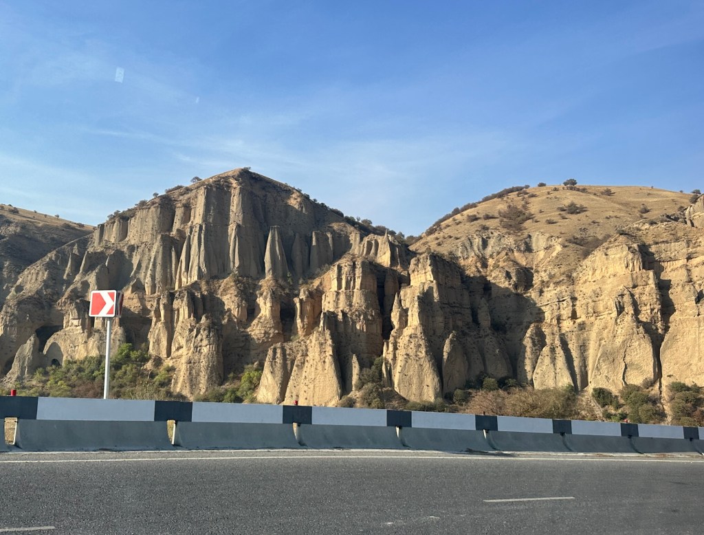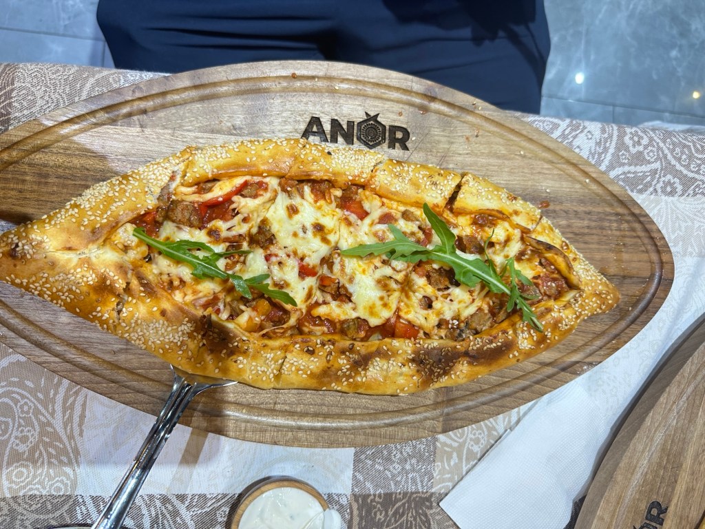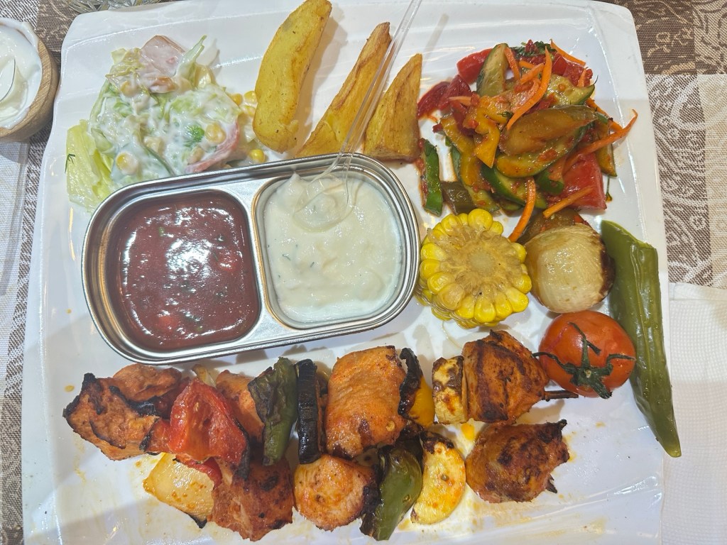 We check into the Karagat Hotel, then do a quick turnaround to go out for dinner at a nice restaurant. I had a delicious chicken roll stuffed with spinach and served with a cheese sauce – the only issue was that it arrived after everyone else had finished their meal. Coordinating serving meals has not been a strong point in any of these countries. But who’s complaining!