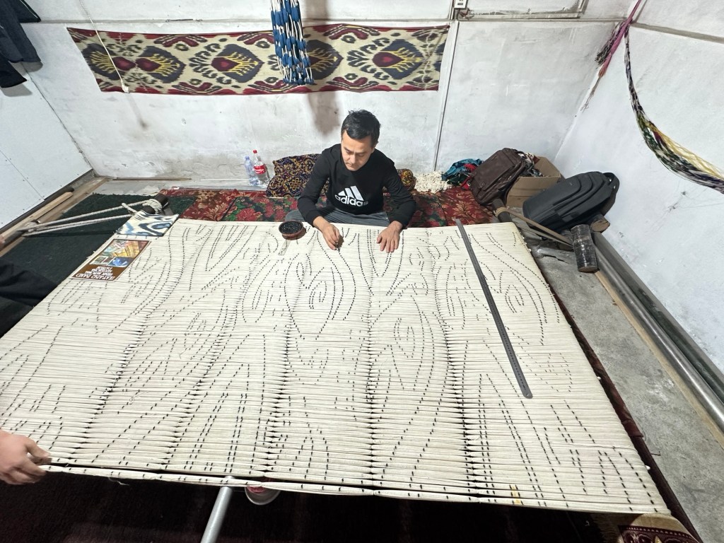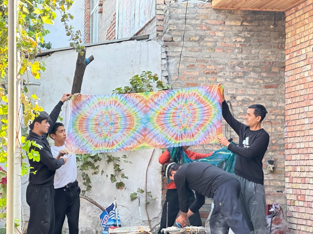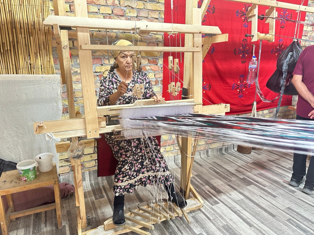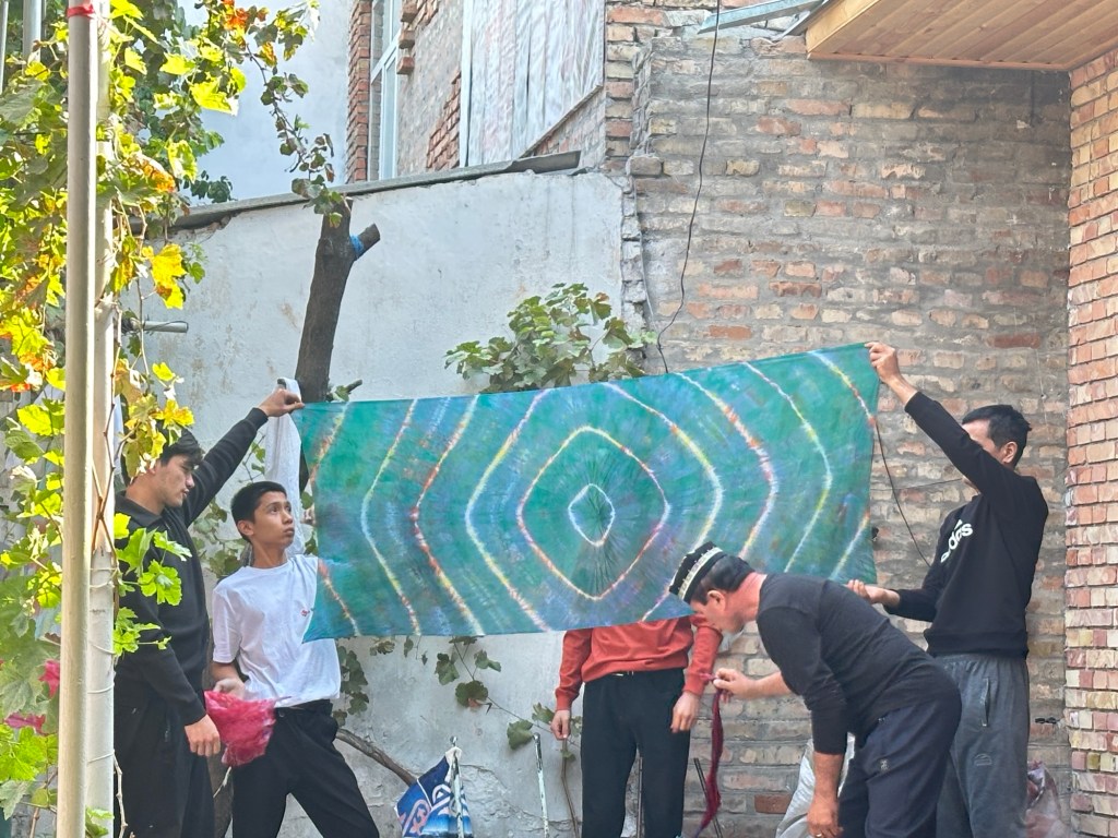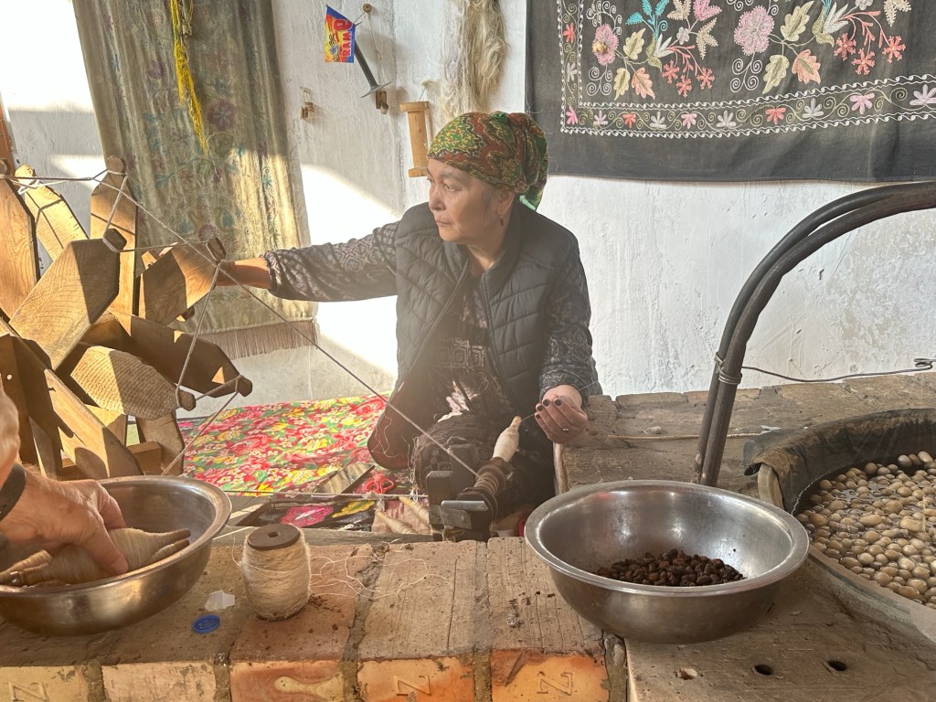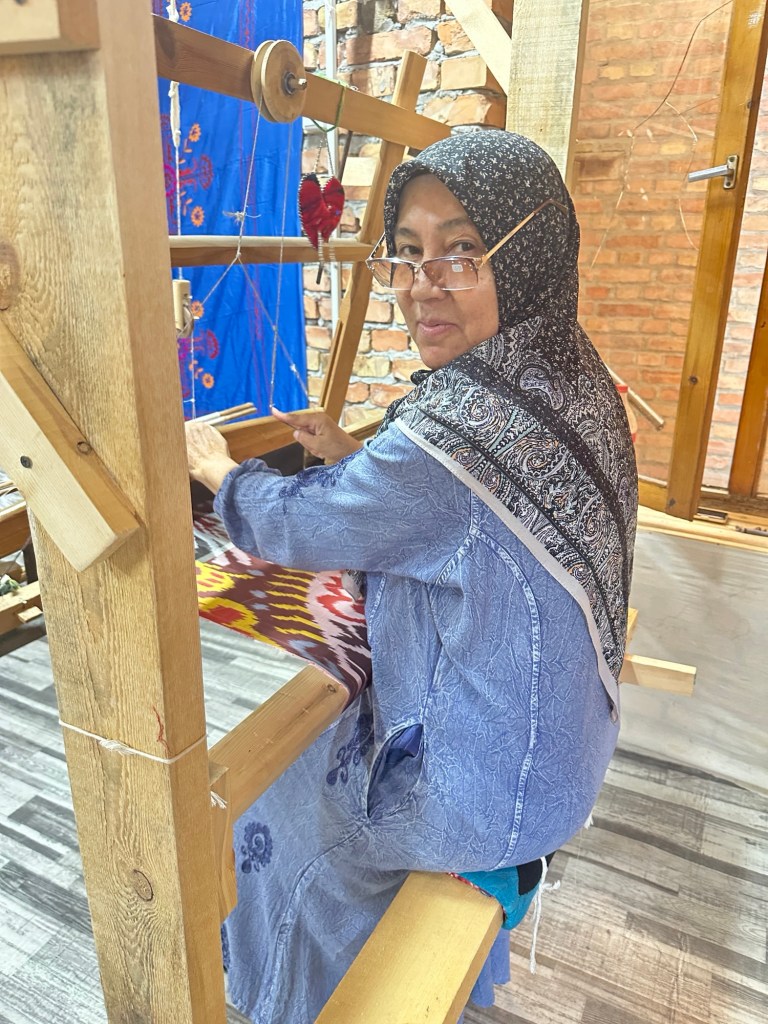 After breakfast our local guide took us to a silk weaving and dyeing family workshop functioning since 1810. Margilan was an important stop on the Silk Road. The local mulberry trees have fed silk production for centuries, and the economic life of the town is still dominated by the enormous Margilan silk industry.