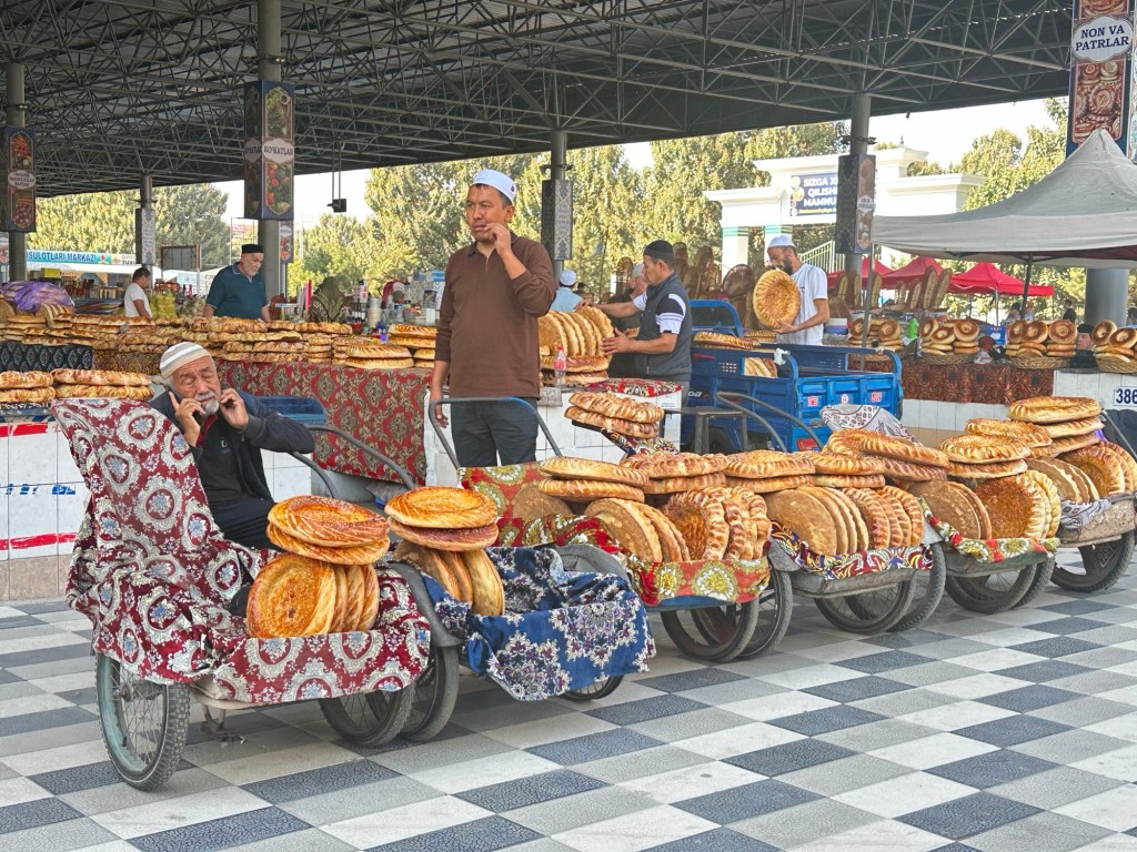 We are now in the Fergana Valley region of Uzbekistan. The valley played a key role in the opening of the Silk Road. Its famed “blood-sweating” horses (believed by the Chinese to be descended from dragons) were in such demand that China forced open the first transcontinental trade routes specifically to gain a supply of the steeds and thus a technical advantage over its marauding nomadic neighbours. The horse trade remained central to the Silk Road long after the secret of silk production had spread to the west.