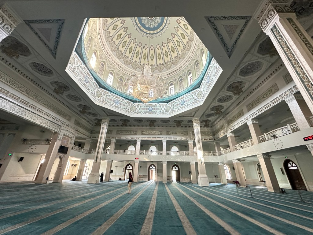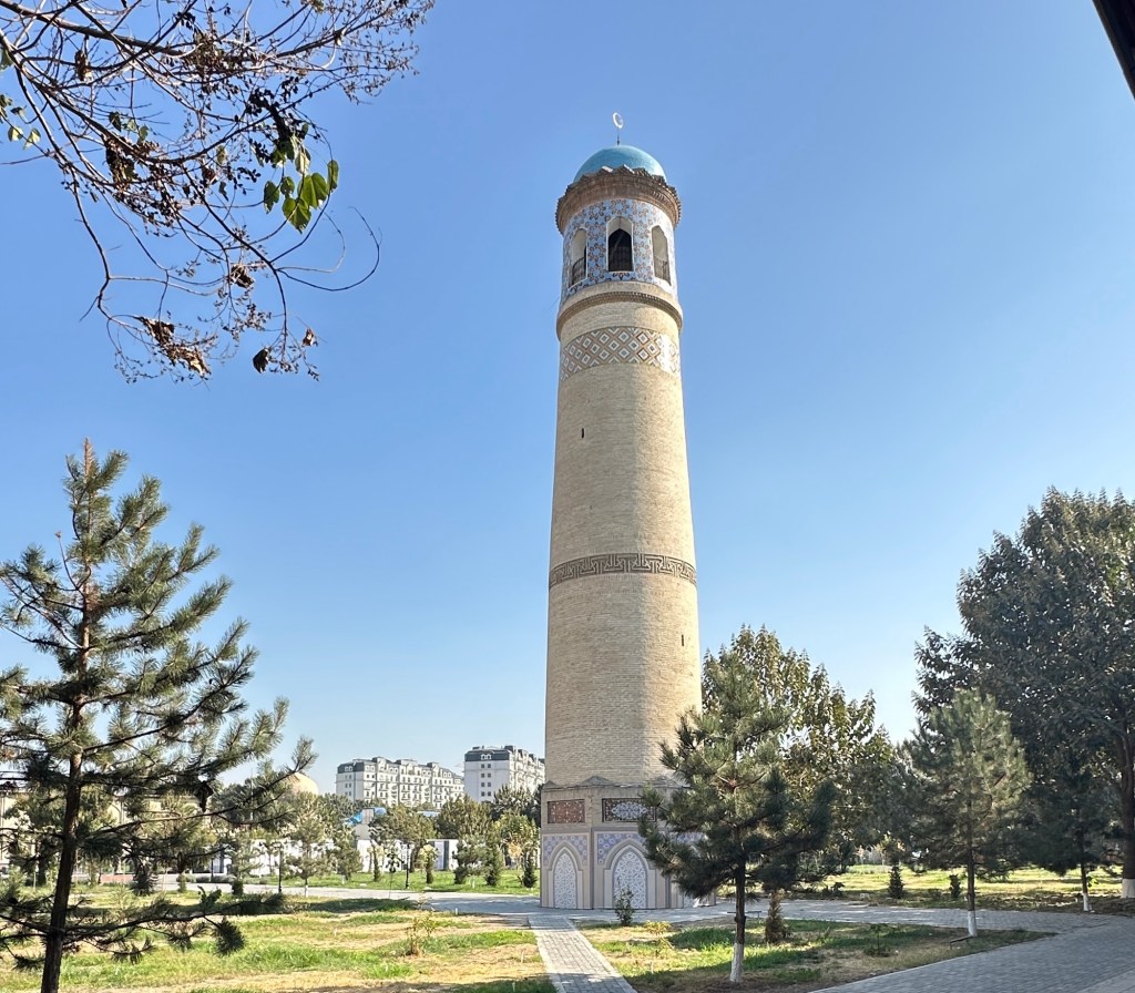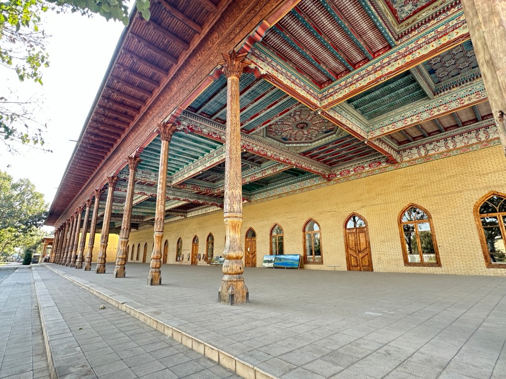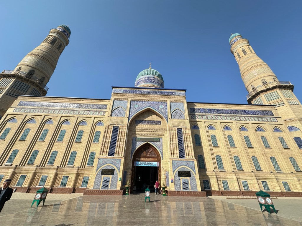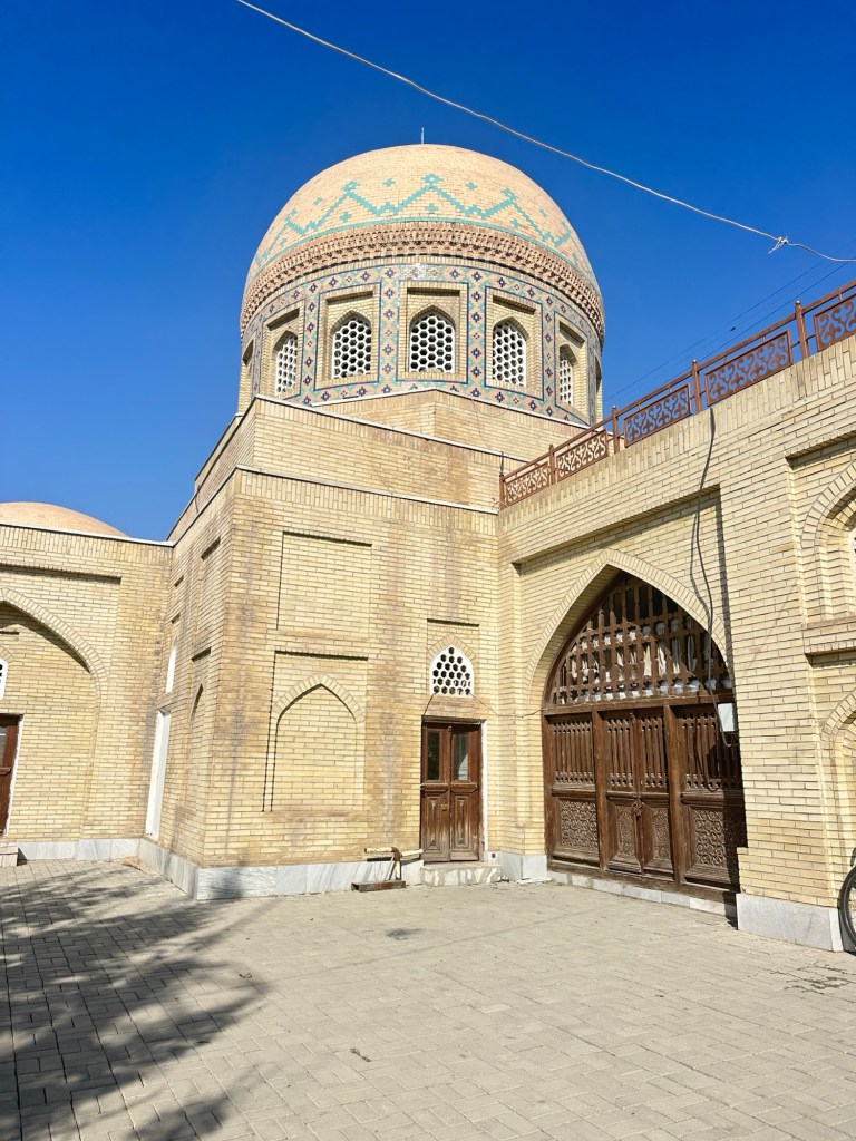 We continue walking through the markets, cross the road to Andijan Juma Mosque (a Friday mosque built in the 19th–20th centuries with a main facade that has 26 arch openings). The madrassa is now handcraft workshops.
