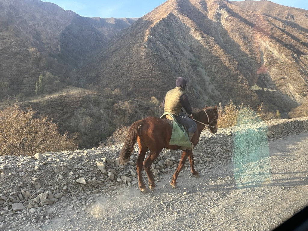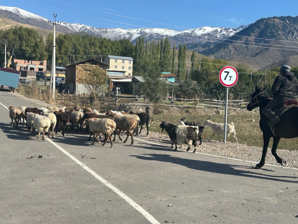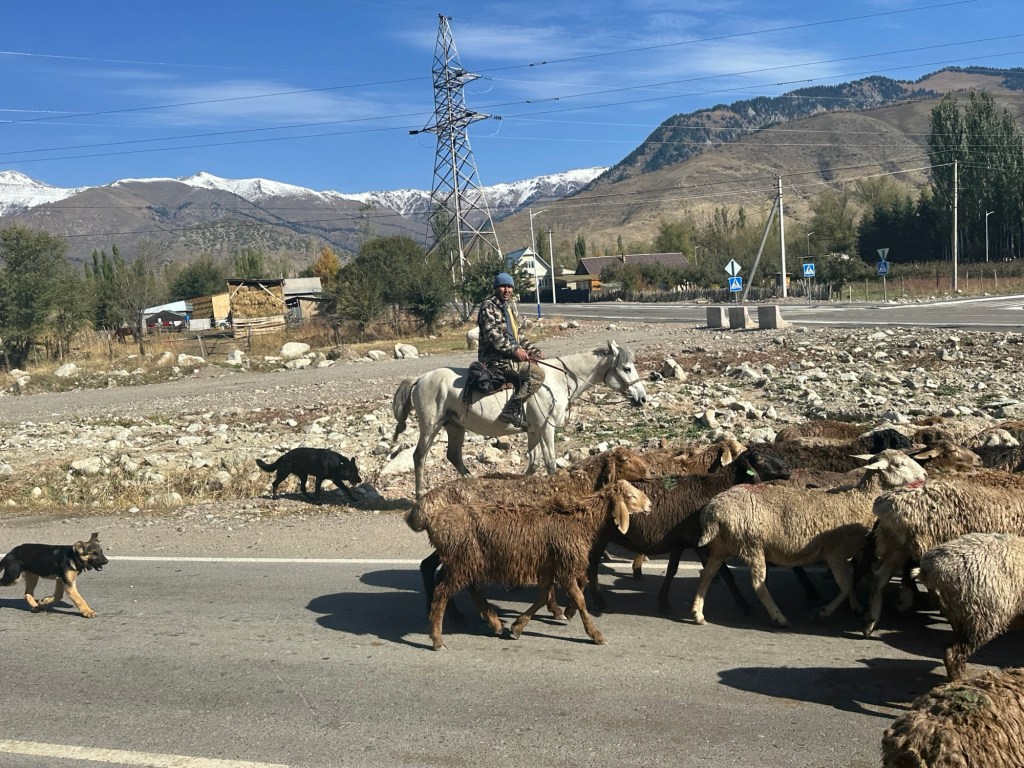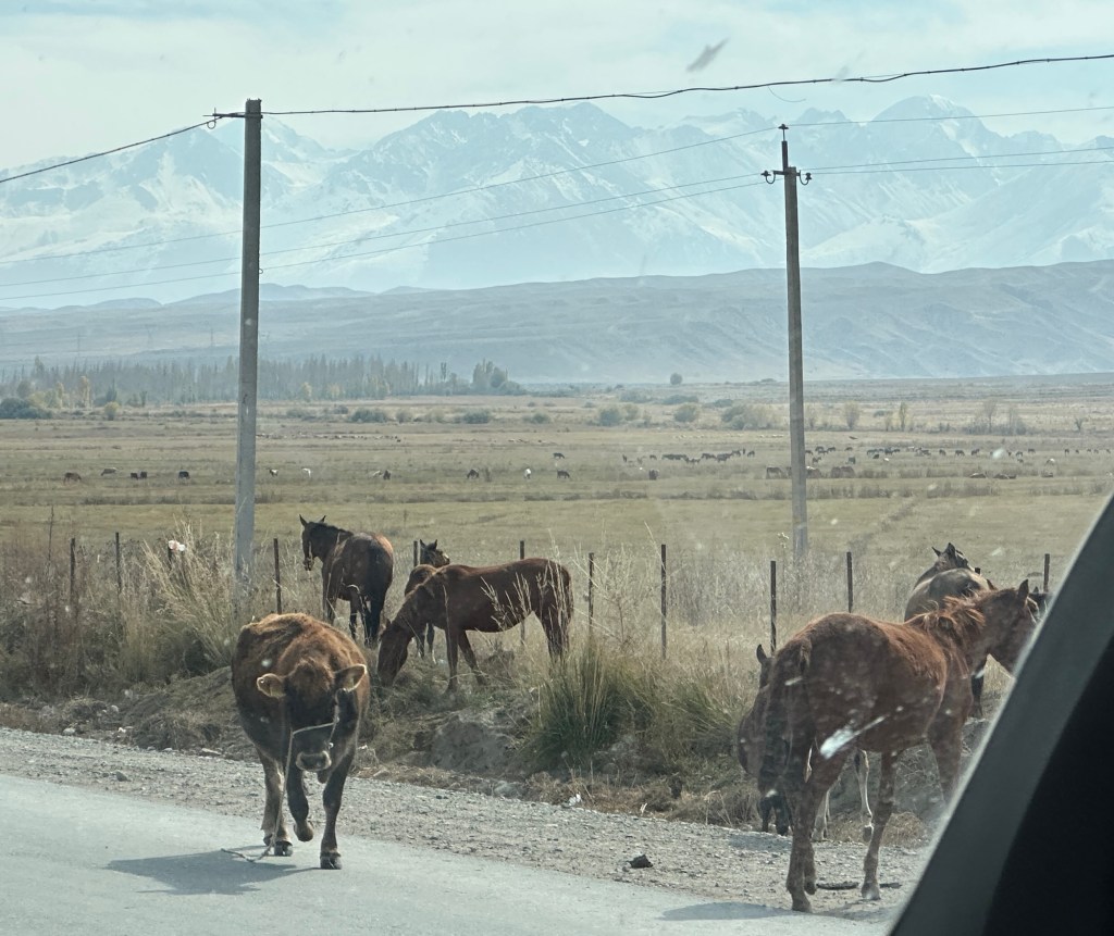 Another hour’s drive to the border, where we passed the border formalities with minimal fuss- only 500 metre walk. Our Kyrgyz guide, Ernest and driver were there to meet us.