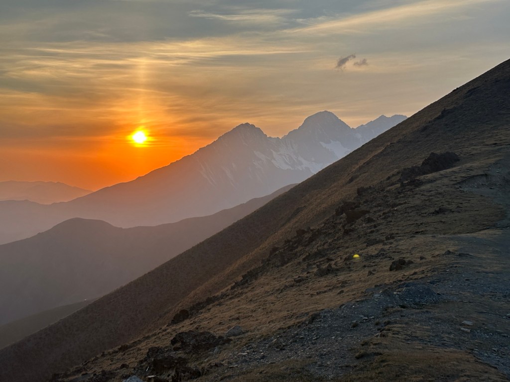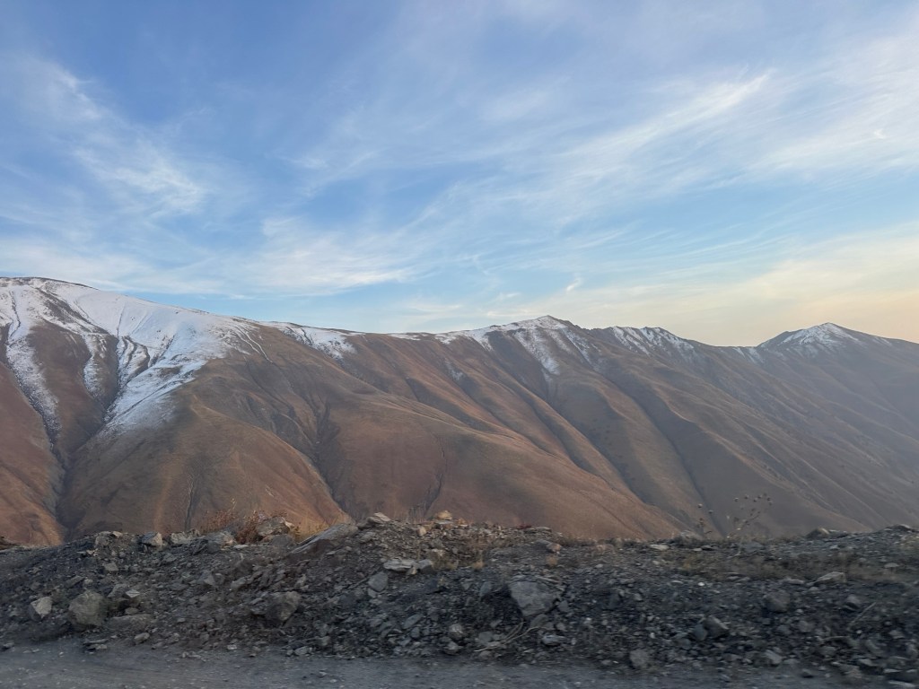From there we had a four hour bone shaking drive on rough unsealed roads (originally we were told it would be five hours but we made good time… or Ernest was preparing us for the worst case scenario) to Kazarman village. We went through two mountain passes getting as high as 2980 metres above sea level – the scenery was spectacular with snow capped rugged peaks and steep valleys. Sheep and goats grazed on the side of the mountains, not sure how they stayed upright. We stopped at the peak for a photo of the sunset over the mountains- the temperature was down to a brisk 5 degrees. The last hour of driving was in the dark – a little bit scary I have to say.