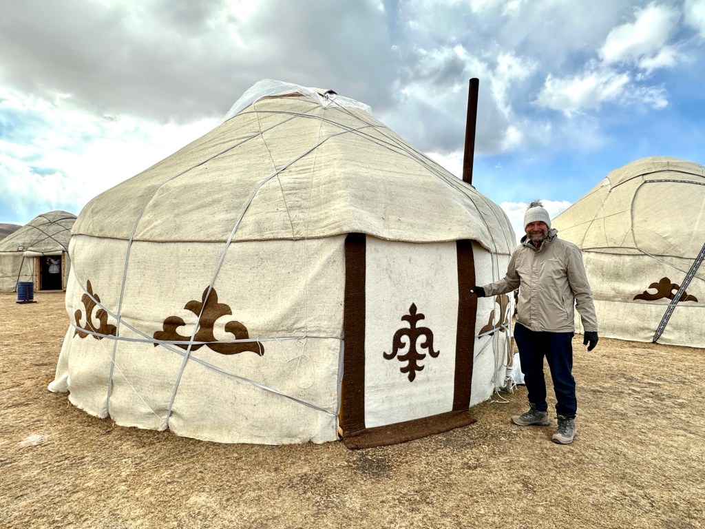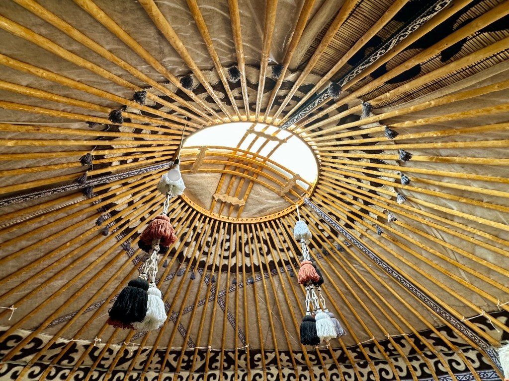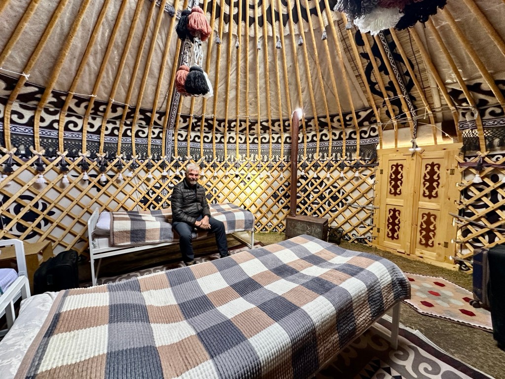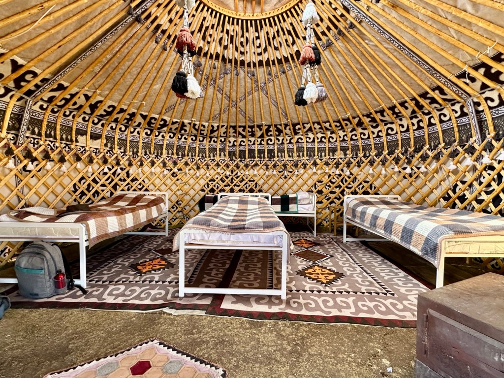 This yurt was more traditional than the one we had stayed in in Turkmenistan. The main wooden skeleton of roof poles supports a collapsible concertina-like wooden lattice that forms the inner wall of the yurt. Reed mats form a middle wall, and thick grey or white felt is placed on top and around the outside. The heaviest sections are the door frame and the circular skylight. The frame is tightened with woven strips and the floor is decorated with appliqué-felt carpets. The key to a yurt’s success is felt – warm in winter, cool in summer and surprisingly waterproof. Inside our yurt were four single beds and wood stove. There was a central light when they turned the generator on at 6pm, otherwise you could pull back the square felt piece over the whole in the roof to let in some light.