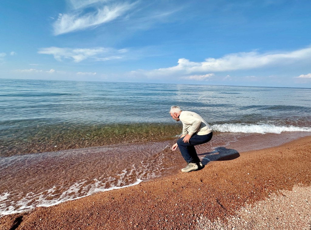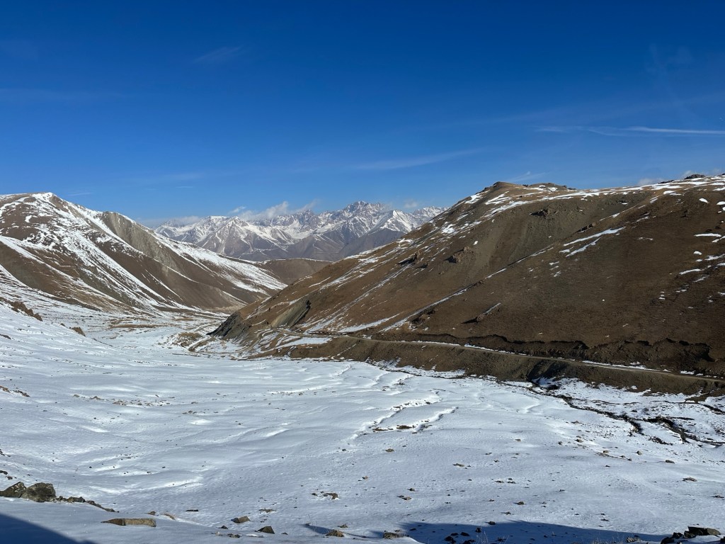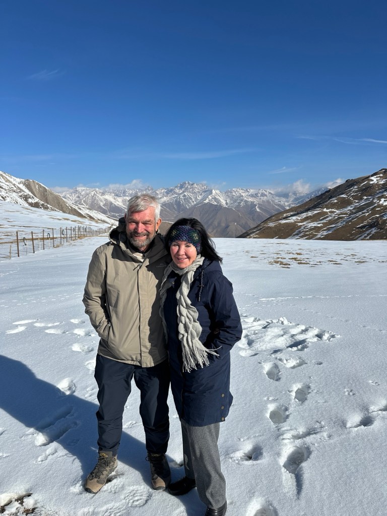 We were very relieved to be getting into our warm van and start the drive to Issyk-Kul along the south shore. We had another pass in the Tian Shan Mountains at 3460 metre. Surrounded by snow capped peaks, I felt we were in Switzerland. Snow and ice on the road called for a cautious descent.
