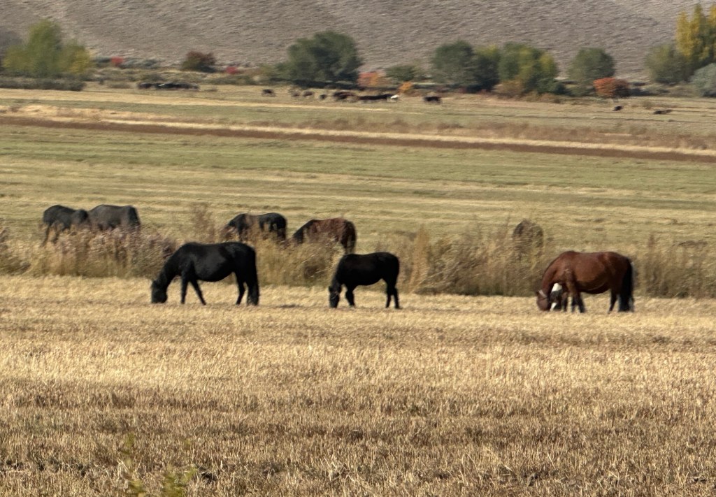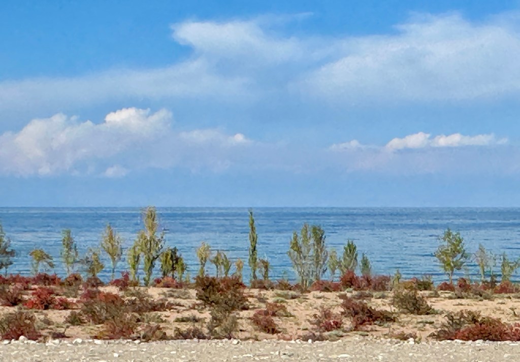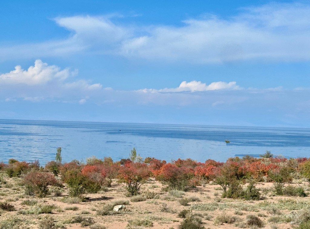 A brief coffee stop at Kochkor then a scenic drive on sealed and unsealed roads to Issyk-Kul – farms, villages, every type of livestock – sheep, donkeys, cattle, horses (so many horses), even yaks. Apricot trees are plentiful here. Currently a railway line is being constructed along the road – it will extend from China to Turkey, and then link up with the existing line going through Europe. It will really open up trade in Central Asia.