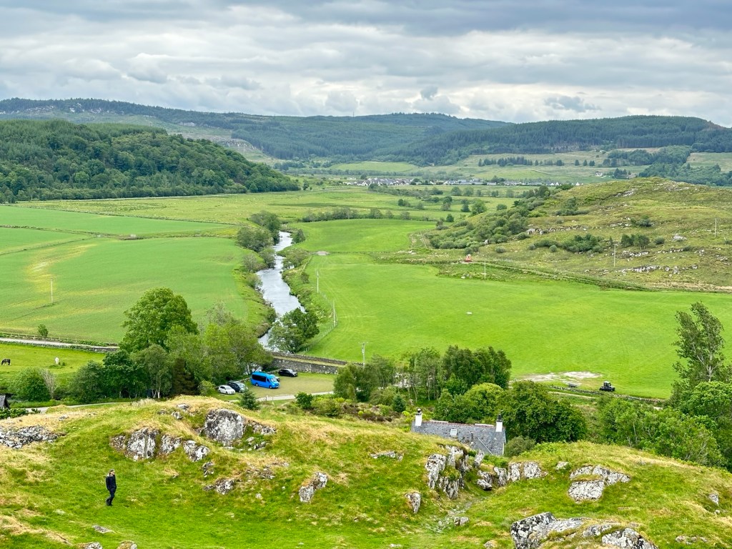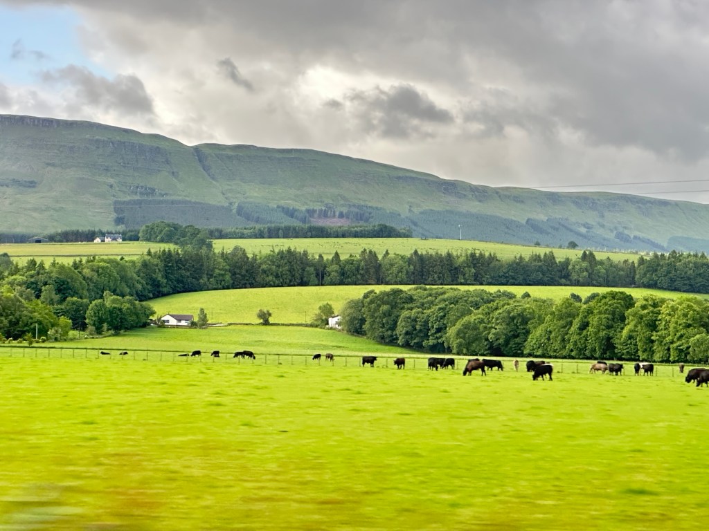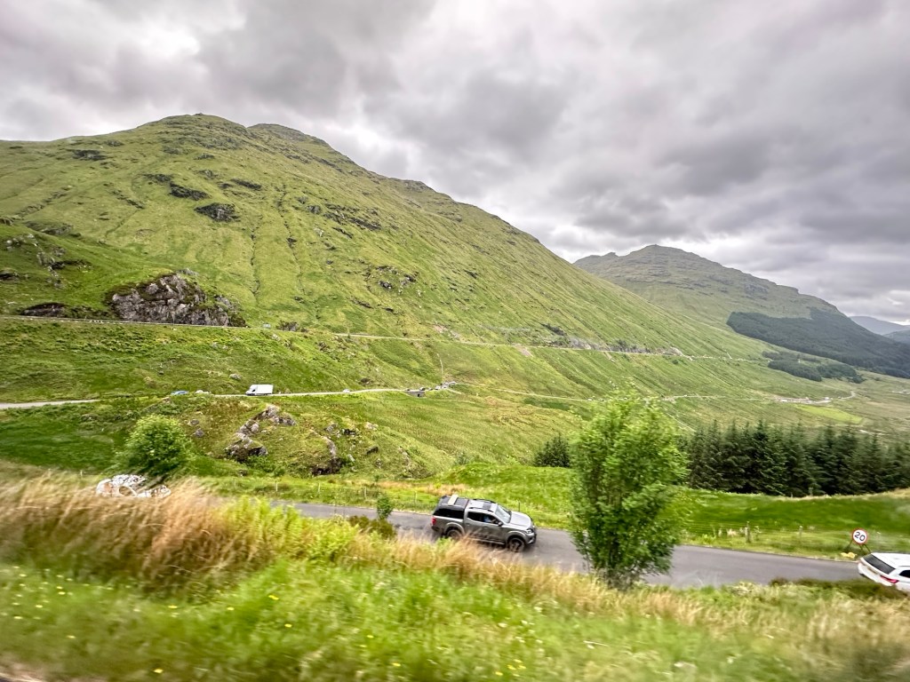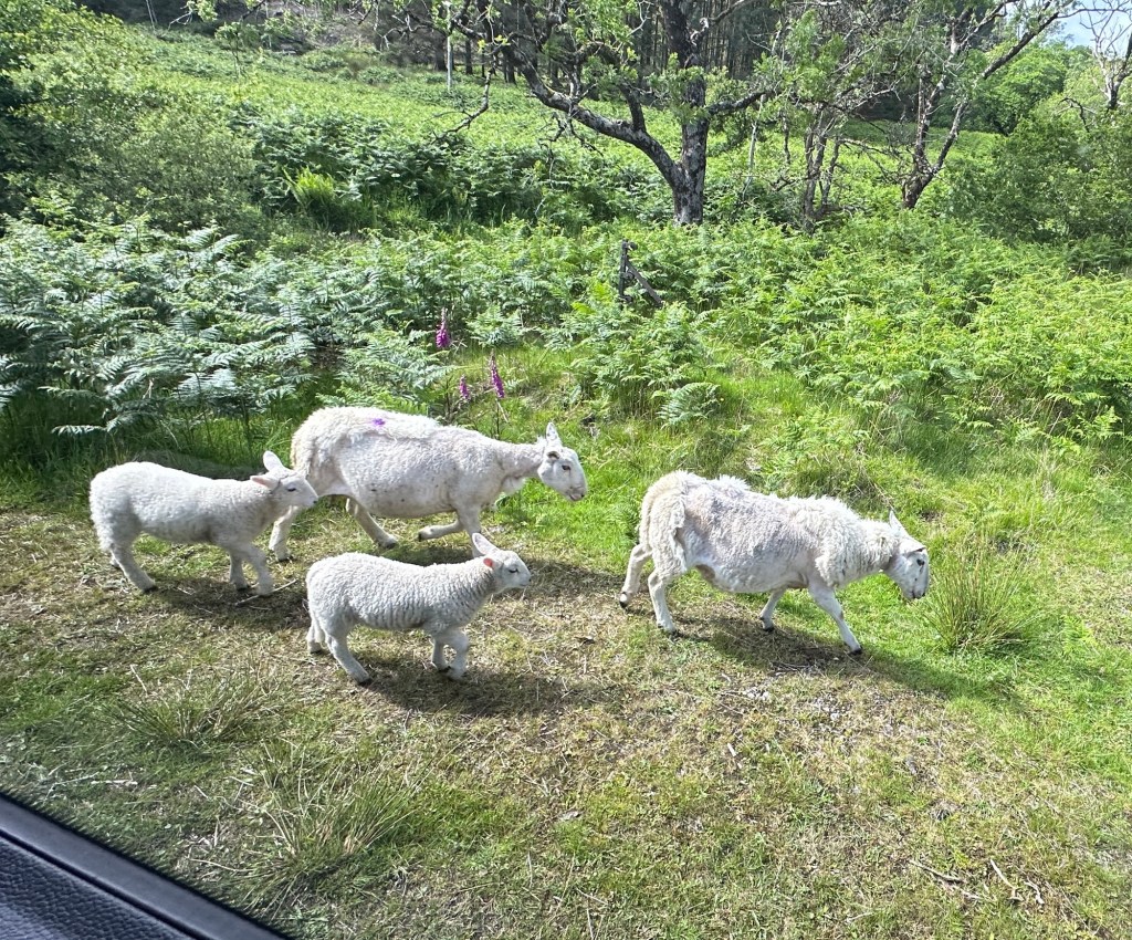 The scenery changed every hour as we travelled west – farmlands to wooded forests on hillsides, to a stunning view at Rest and Be Thankful viewpoint after going up a hairpin military pass. Again, the sheep and cows seem so big here.