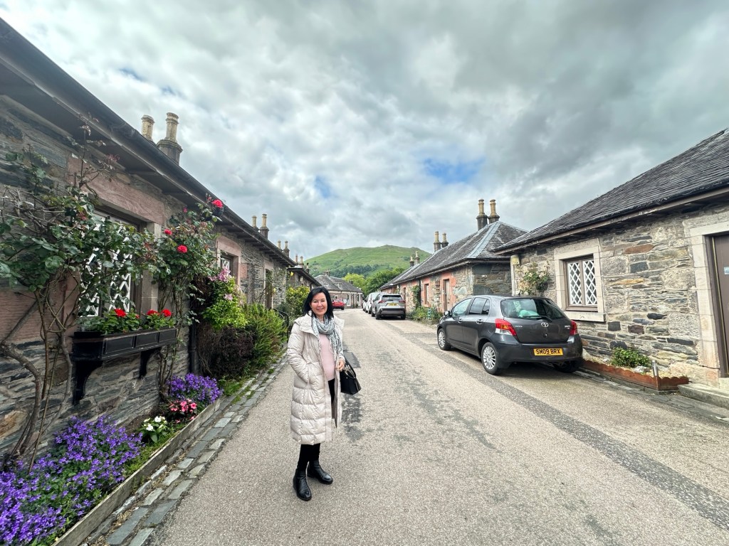 Today we commence a four day small group tour starting from Edinburgh. We head west past Stirling towards the picturesque Loch Lomond. On the banks of Loch Lomond, overlooking tranquil wooded islands, the ancient settlement of Luss was rebuilt in the 19th century – a good choice for a morning tea stop. The street was lined with quaint thatched roofed houses and pretty flowers – the roses were a highlight here, and ever so strongly scented.
