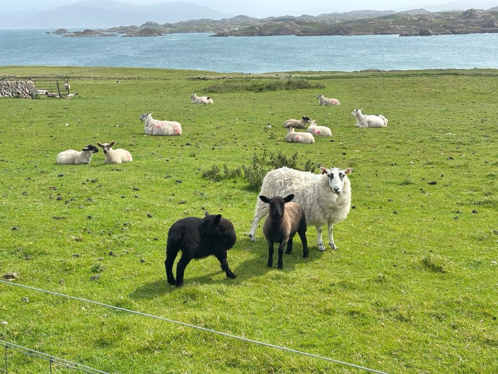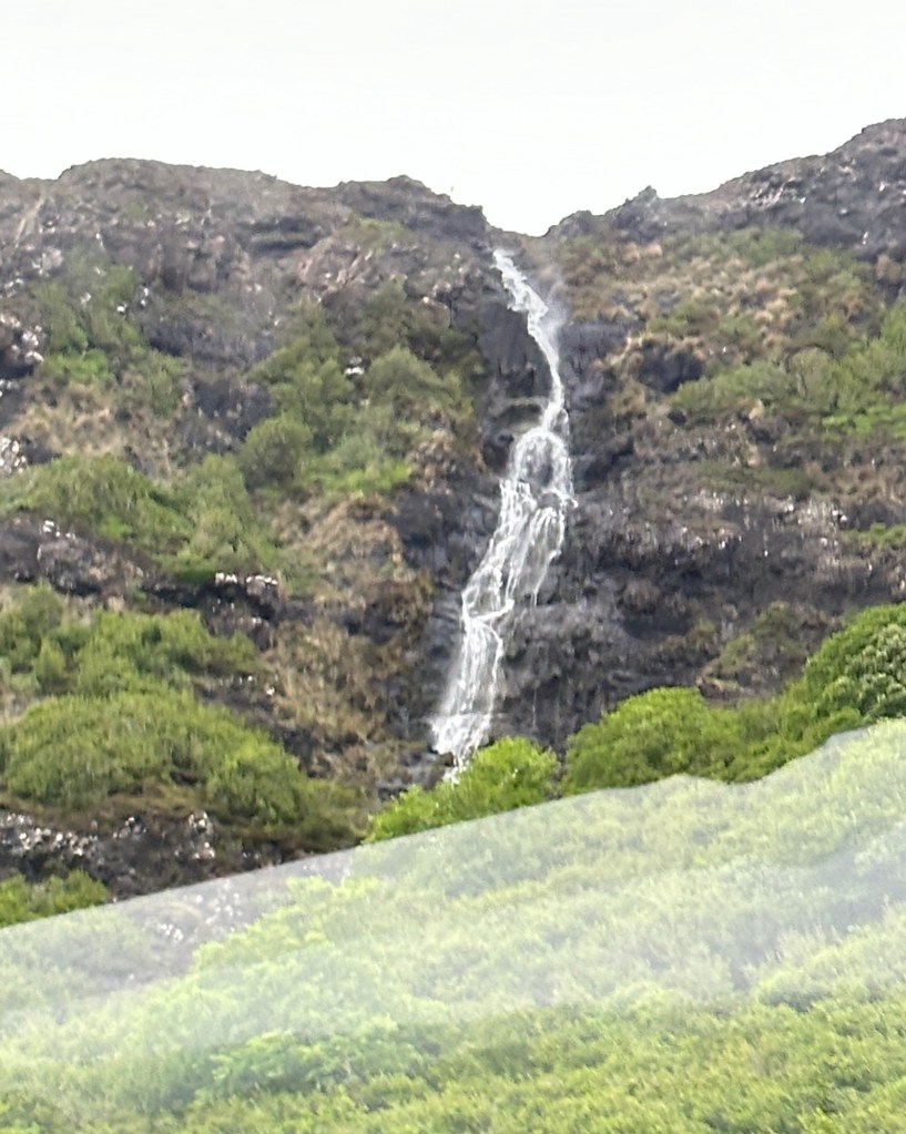 Ferry back to Mull – it was a rougher trip this time. A different route took us through the middle of the island, around Ben More (mountain), all on windy single lane roads, back to Tobermory. The scenery was absolutely amazing! Rugged and dramatic! And so green, with a waterfall at every turn. The gorgeous sheep and their lambs, alongside the roads, then all the way up the steepest mountains. Also cows – alas no Highland cows. We looked for otters- but they remained elusive. We made many stops to enjoy the sights. It was cold- the wind chill factor was very icy. When we arrived back at the charming colourful Tobermory, the temperature was 9 degrees, but felt like 0 degrees according to the app!