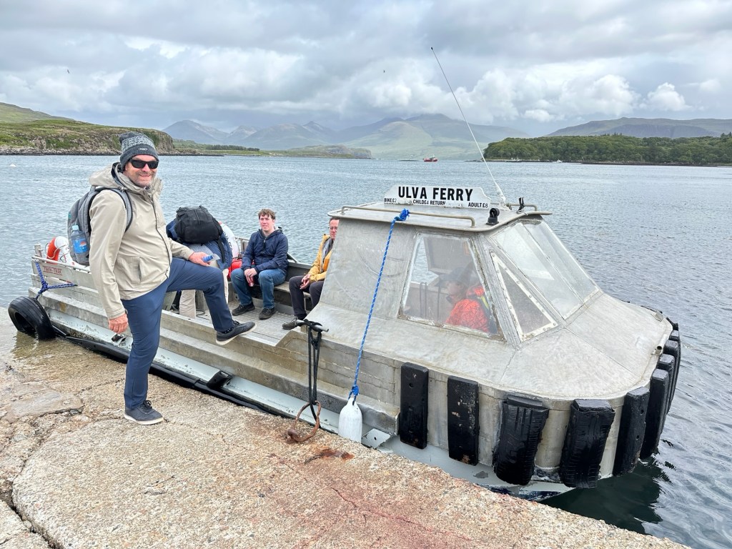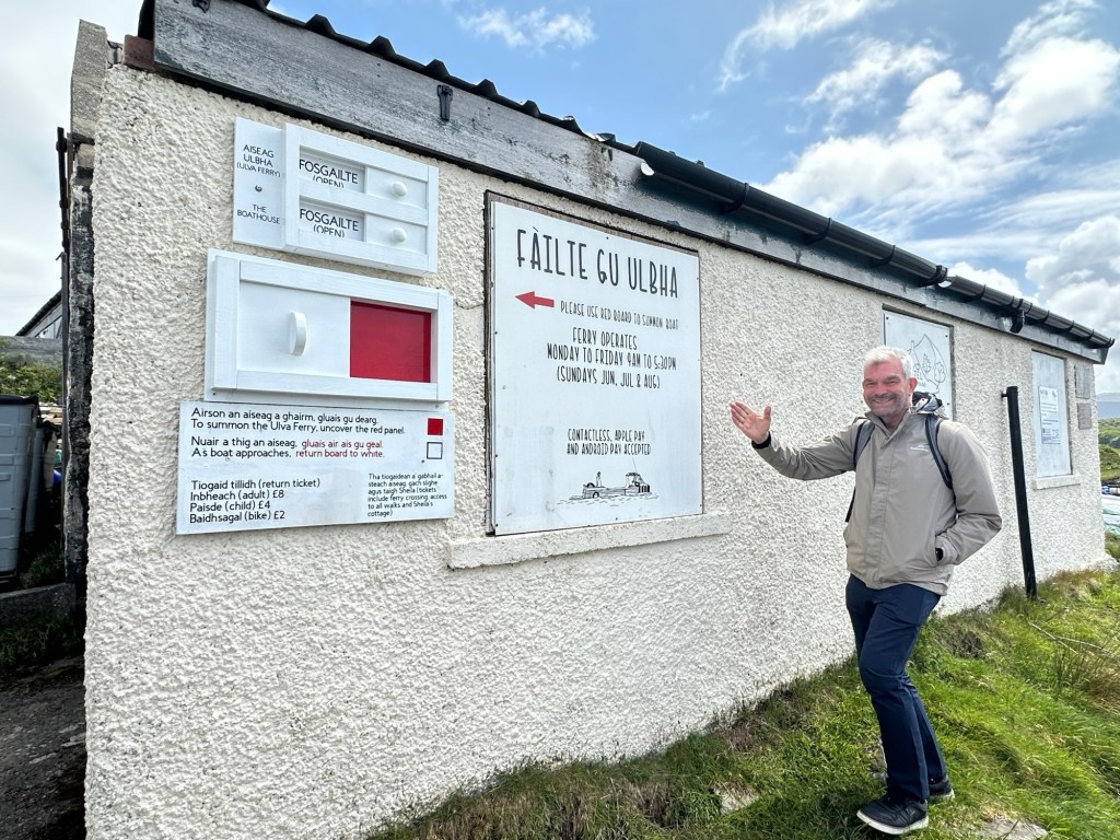 One hour’s driving along narrow steep roads and we arrive at the ferry terminal to go across to the Isle of Ulva. We called the ferry (see photo) and two minutes later, Rory ferried us across to the island (he can only take 8 passengers at a time)