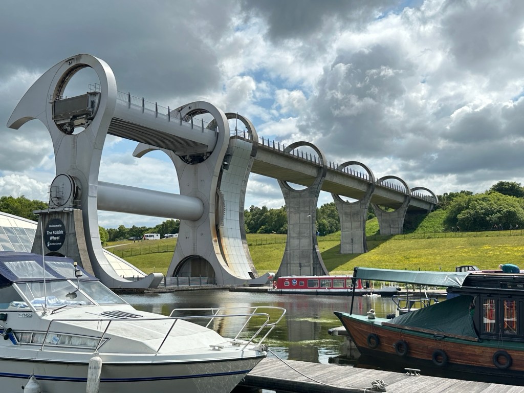 Onto the Falkirk Wheel, the world’s only rotating boat lift, The Falkirk Wheel links the Forth & Clyde Canal to the Union Canal 35 metres above, allowing vessels to sail through the sky thanks to a unique fusion of art and engineering – and the same power it would take to boil eight kettles. Transforming the contaminated site of a former tar works, The Falkirk Wheel opened in 2002 and replaced a flight of 11 locks that once stepped the Union Canal down to the level of the Forth & Clyde, more than 100 feet below. We timed our arrival nicely to see the wheel doing its rotation – it only takes 5 minutes to turn 180 degrees. Fascinating!