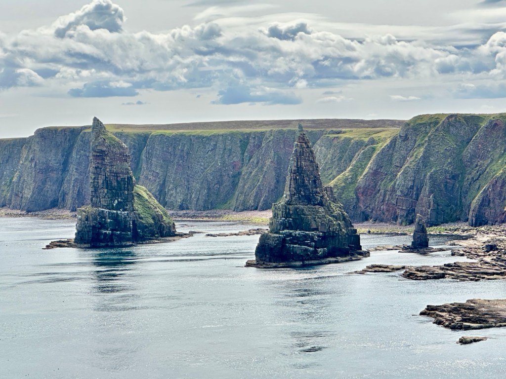 A little further across the clifftop fields, we had the stunning view south to Thirle Door and the Stacks of Duncansby. The first is a rocky arch, the second a group of large jagged sea stacks.