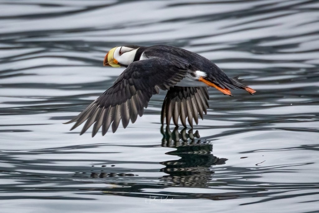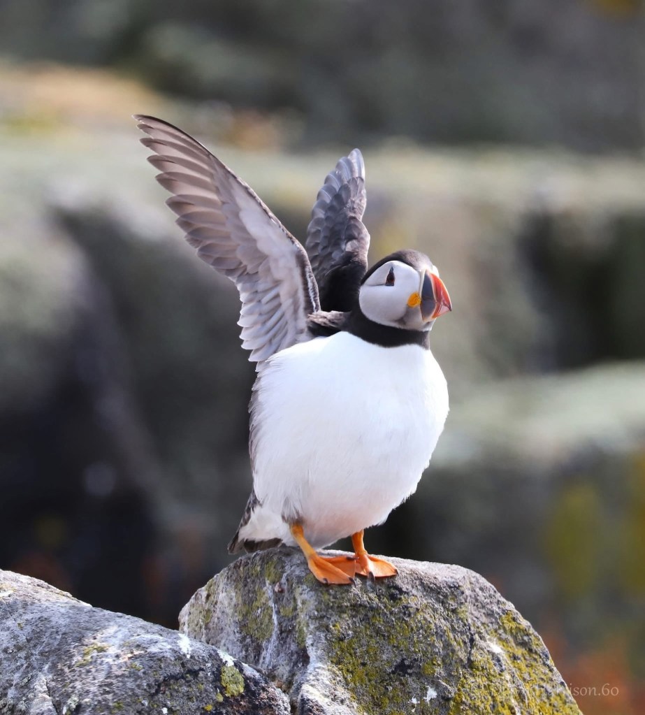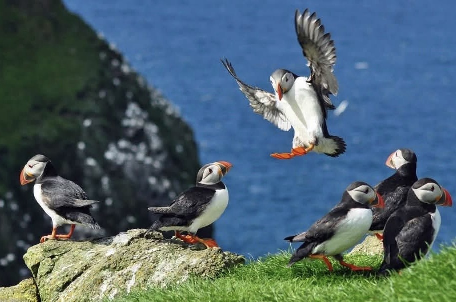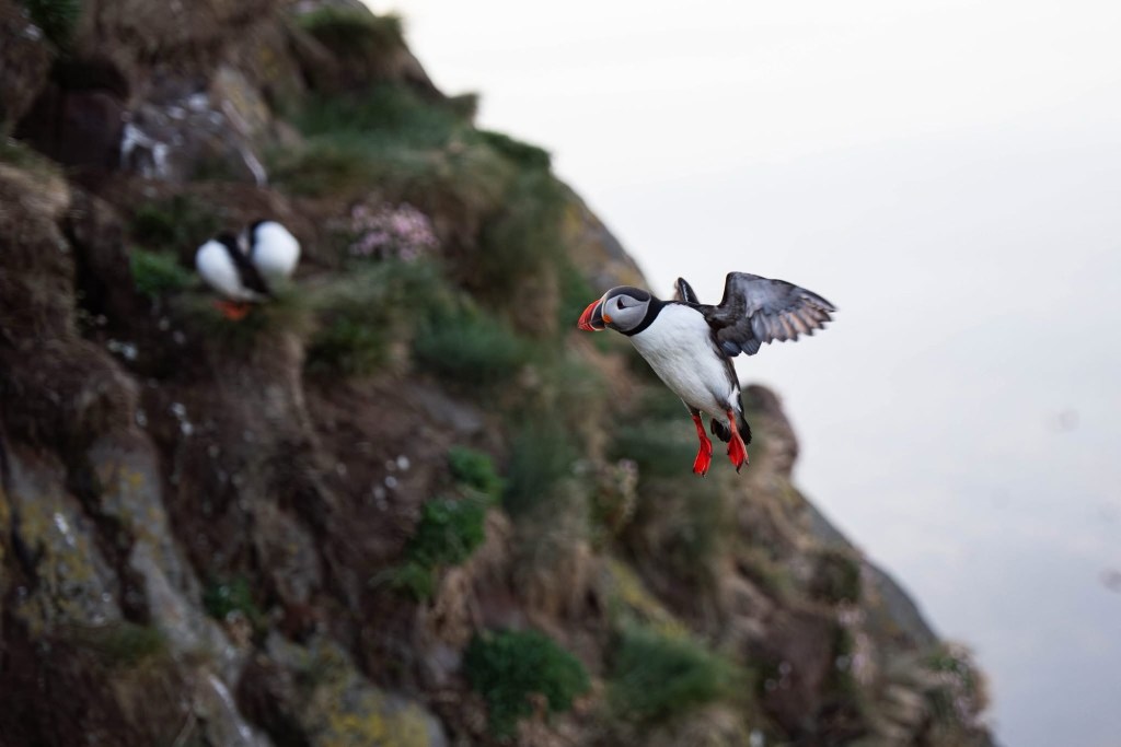 Puffins are unmistakable birds with their black back and white underparts, distinctive black head with large pale cheeks and their tall, flattened, brightly-coloured bill. Its comical appearance is heightened by its red and black eye-markings and bright orange legs. Used as a symbol for books and other items, this clown among seabirds is one of the world’s favourite birds. Puffins spend most of their lives at sea, only landing on coastal islands in spring and summer to form breeding colonies. I could now relax – I have seen my puffins!