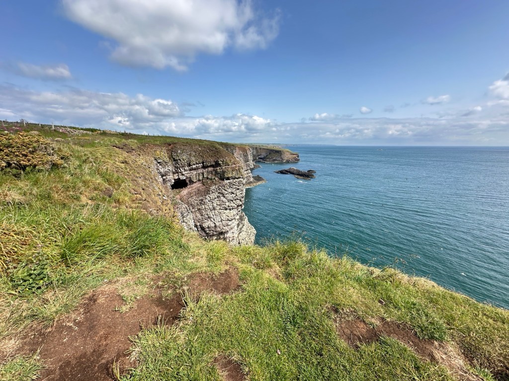 We walked along the cliff edge , amongst rabbit and bird burrows, for just over one km. So many birds!!! In amongst the kittiwakes, fulmars, and guillemots, we see three puffins!!! Yay! They are so cute. One flew off to go fishing, one was strutting about in a cave, and the other was preening itself on a ledge. We met a lovely young Indian guy( who we nearly ran over on the way in – he had his head phones on and couldn’t hear us trailing him on the narrow road) – he tagged along with us, sharing his binoculars and the photos he took. He was so sweet.
