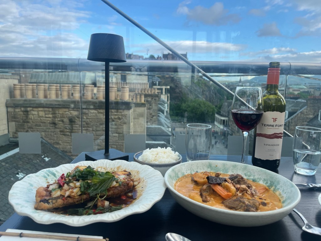 We walked up the hill, into the New Town, to find Chaophraya Thai restaurant – a recommendation from our Scottish friend, Laura. And what a great find it was – delicious food whilst enjoying spectacular views over at the castle, and all while the sun was shining. What a fabulous way to finish our exciting day in Edinburgh.