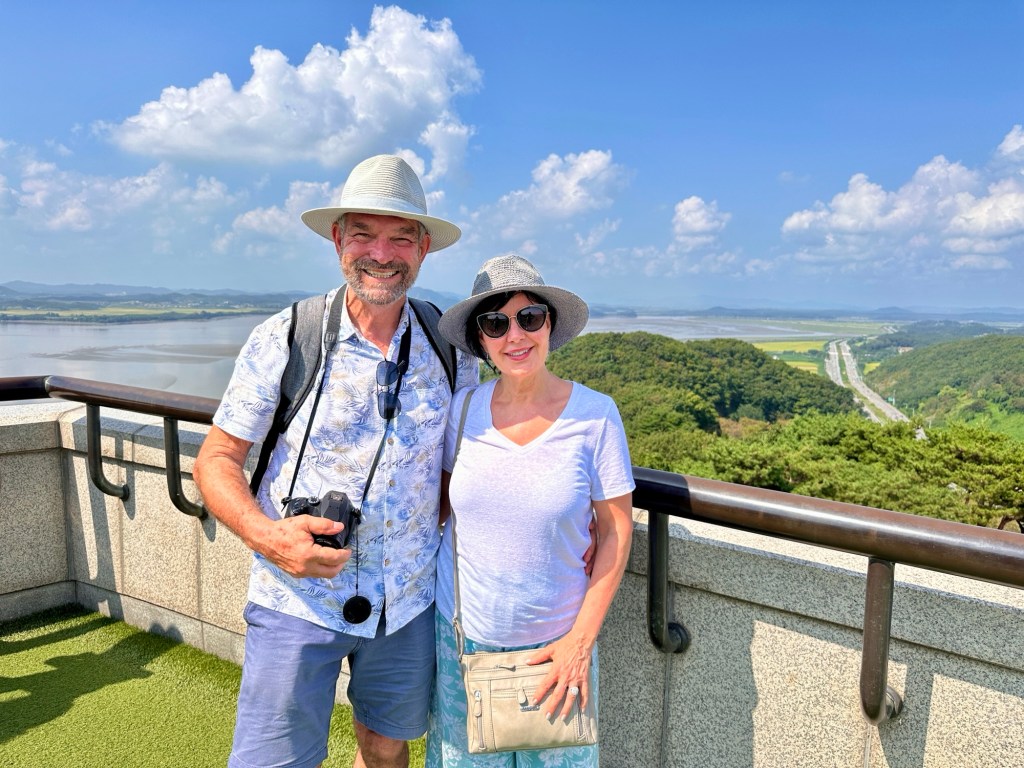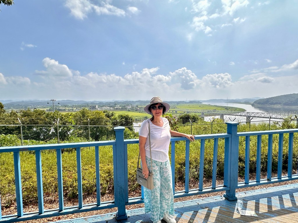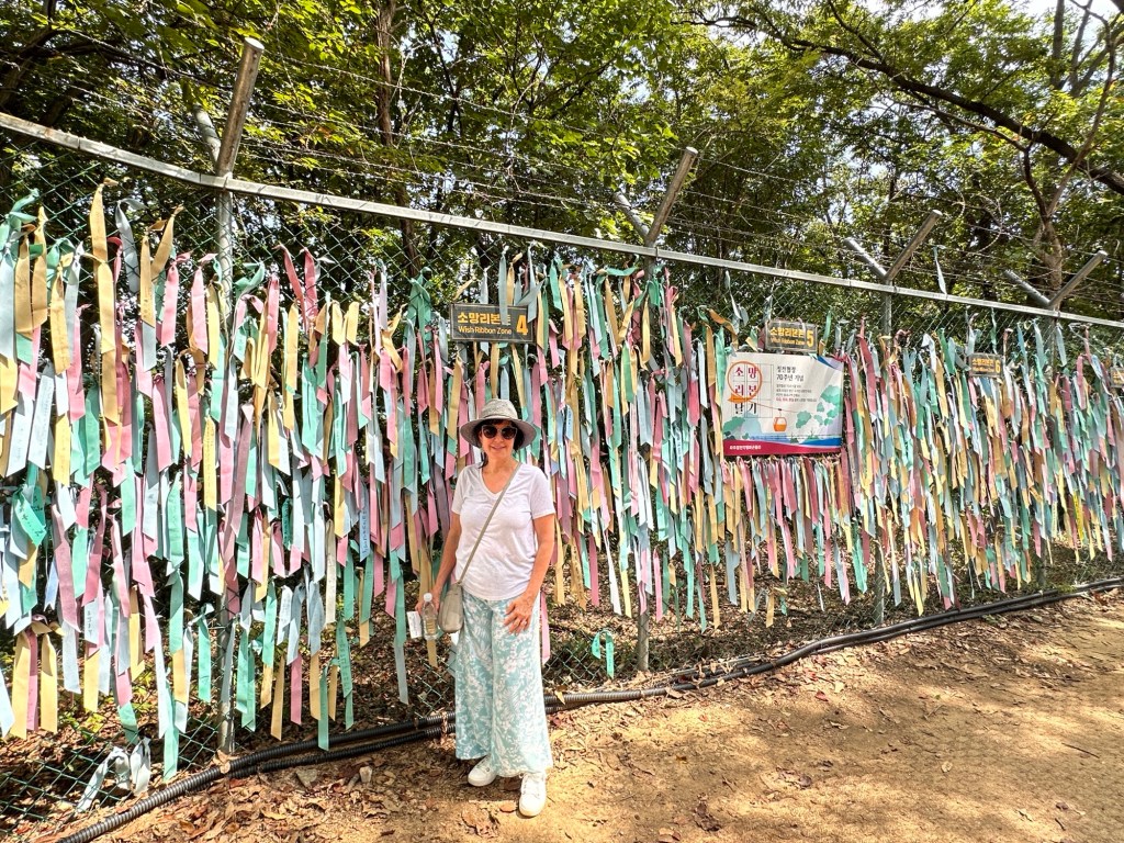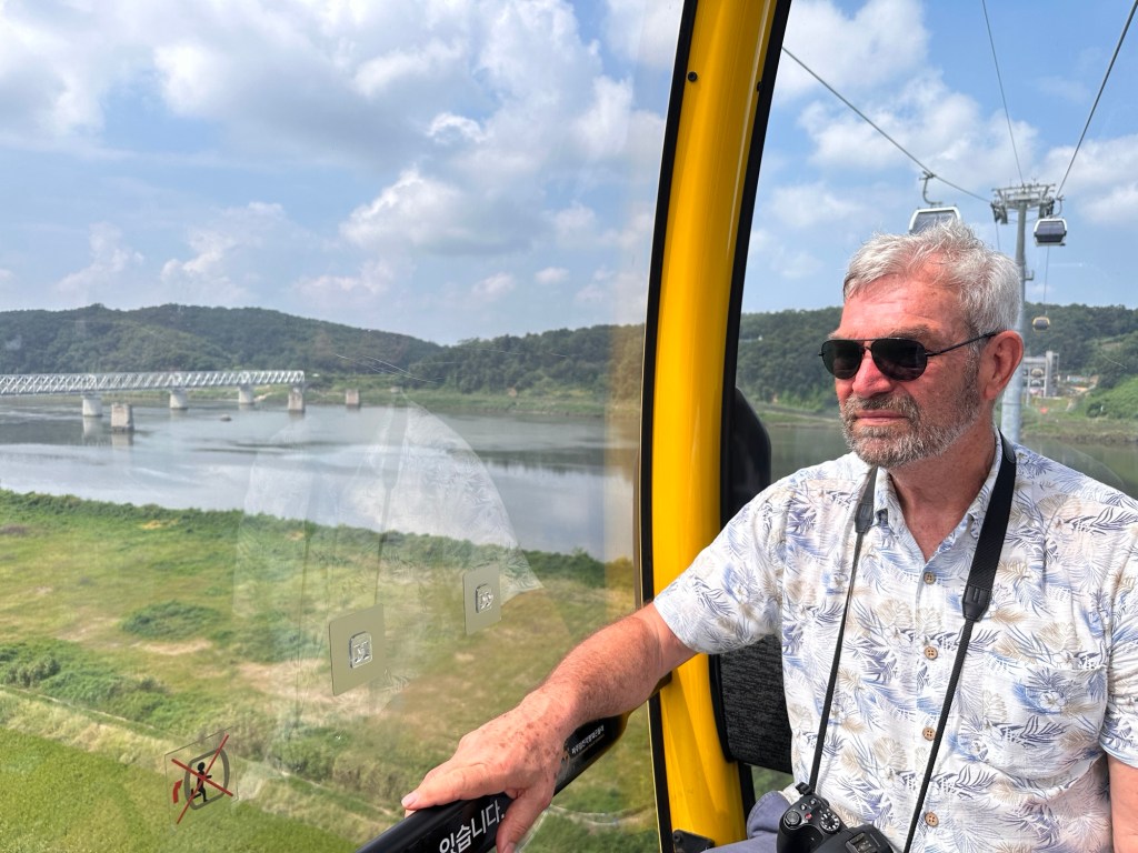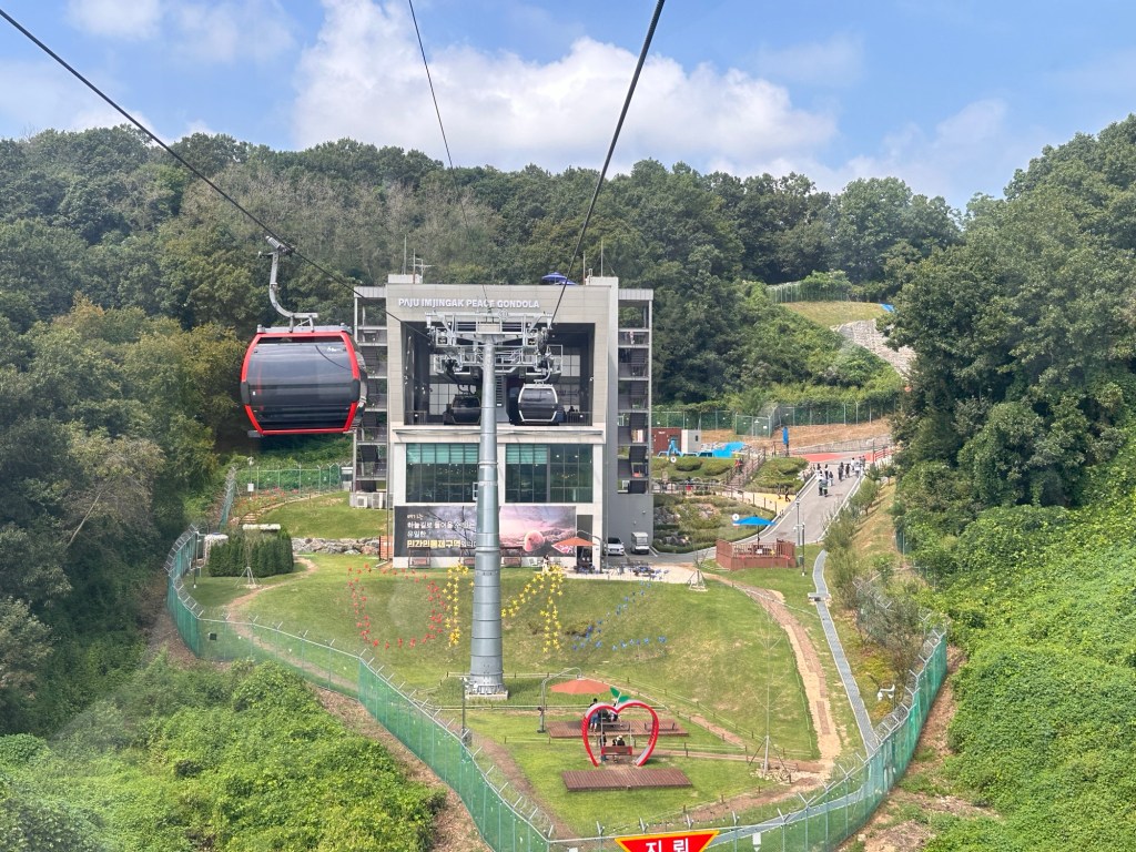Next we went on the DMZ Peace Gondola which travels the Civilian Control Zone. On the gondola, we could see rice paddies alongside the Imjingang River below – the farmland is looked after by residents of the Unification Village. Once on the Northside, we walked up a very steep hill to the Imjingang observatory and looked back to the Freedom Bridge and Dolce Bridge. The Wish Ribbon Zone was very sobering.