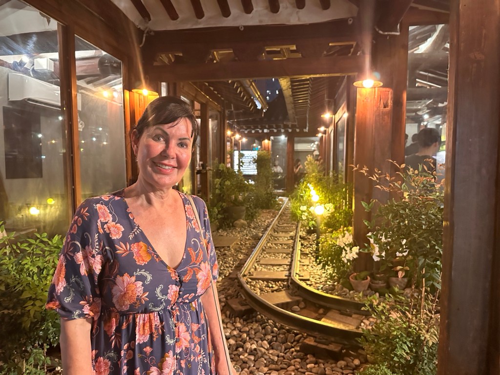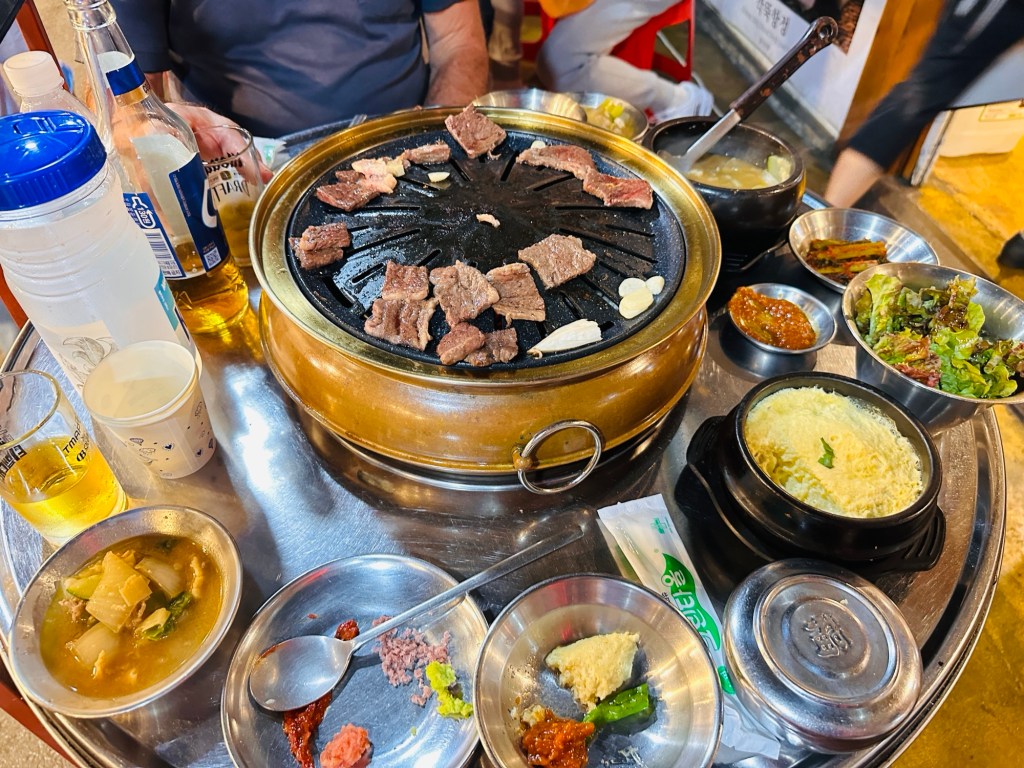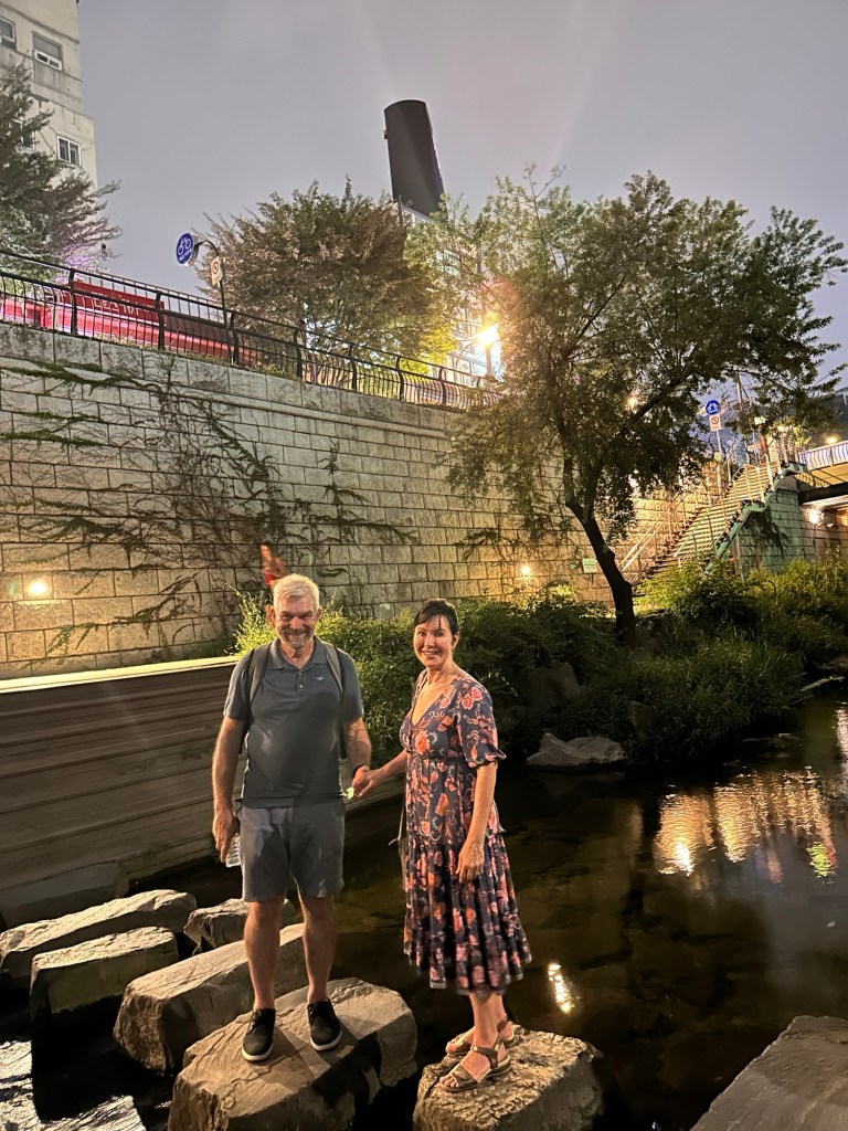 Some time left back in Seoul to explore more of the little alleyways – they just go on and on for miles ! Where to have dinner tonight …. so many choices!!! We ended up in a little laneway ( one of thousands), this time having the beef Korean Bbq. Our host did not speak any English ( and we didn’t speak any Korean), but we muddled through with lots of sign language! Yummy sauces, and fresh salad and kimchi to accompany the beef. A little more lane exploring – so many people eating out. Found a lovely little bar to enjoy a cocktail before heading back to the hotel, then a nightcap on the rooftop to complete the day.