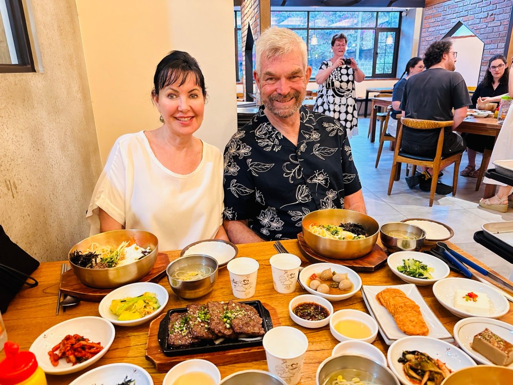 Jeonju is the birthplace of the famous Korean dish Bibimbap (rice with vegetables & meat). There were so many side dishes and condiments – it was like a banquet. Delicious fresh and flavoursome food. A fifteen minute walk back to the hotel, no sign of a bar on the way, so it was an early night after enjoying a glass of wine from the 7/11 in the room.