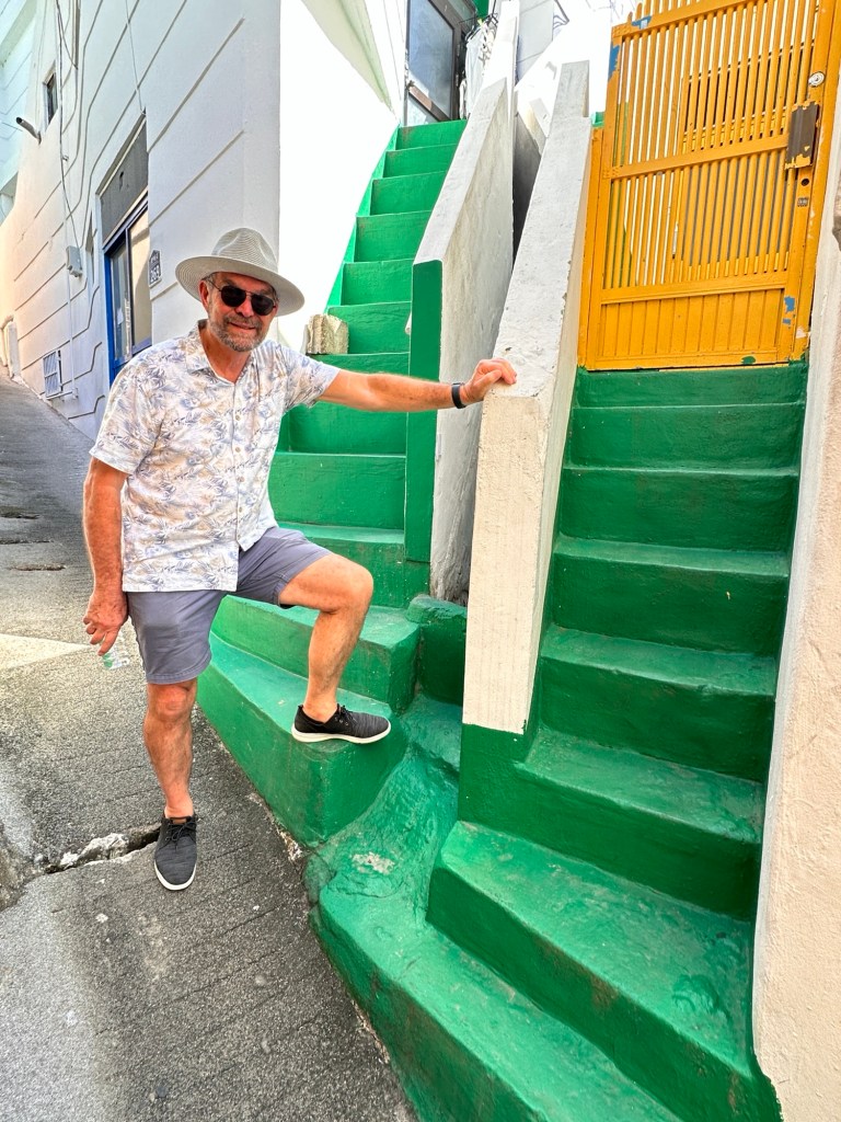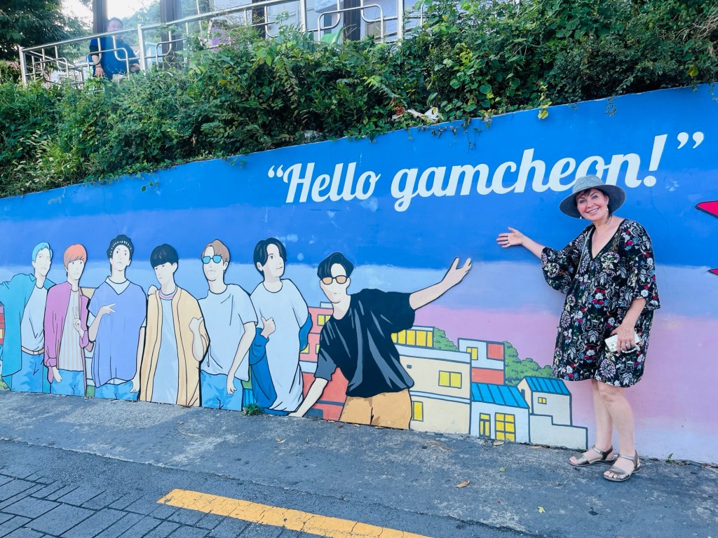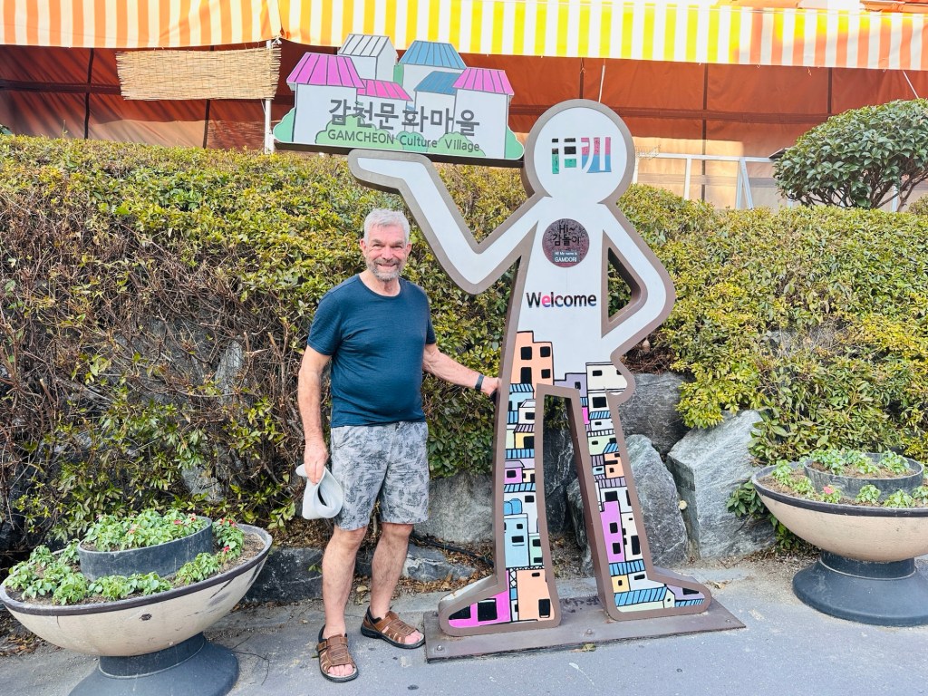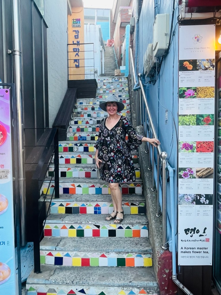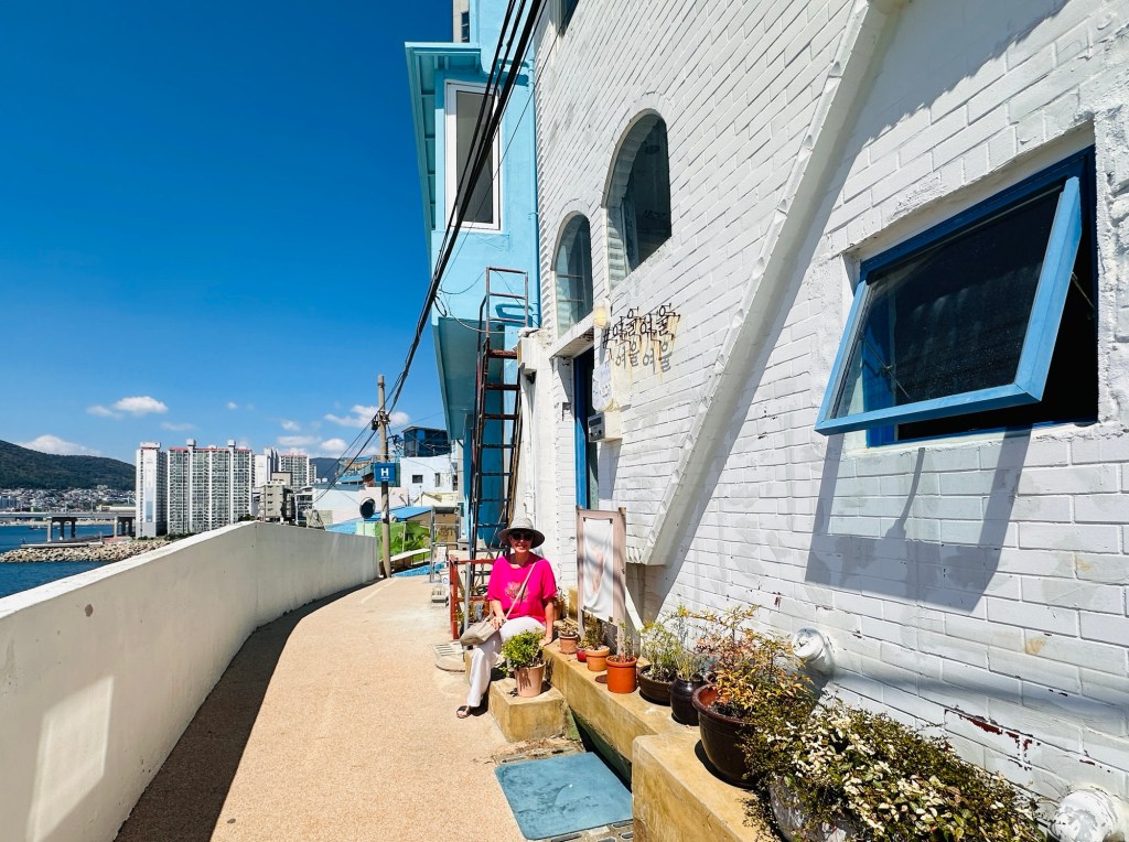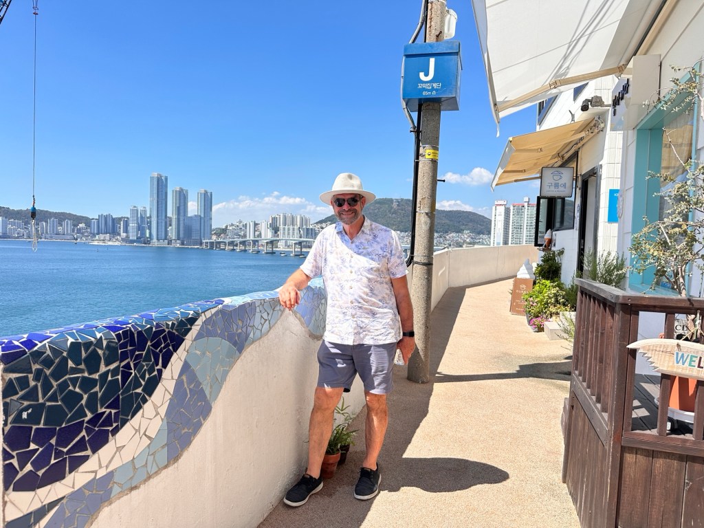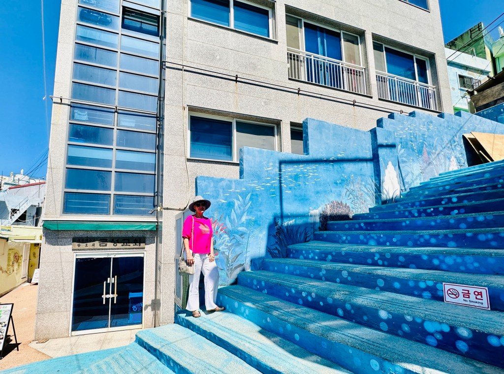 Huinnyeoul Culture Village, a charming coastal village is located on the sloping cliff of Yeongdo in Busan. In December 2011, the old houses of the area were remodelled and the area was reborn as a unique culture and art village where you can walk through and visit cafes and galleries while enjoying the sweeping views of Busan and the ocean. The local description of this village was that it resembled Santorini – again, not quite accurate in my opinion! Maybe the blue and white paint is what the connection was! Not as nice as the village we visited yesterday, but still enjoyable. The heat was very taxing, but a mango ice cream did help to cool us down.