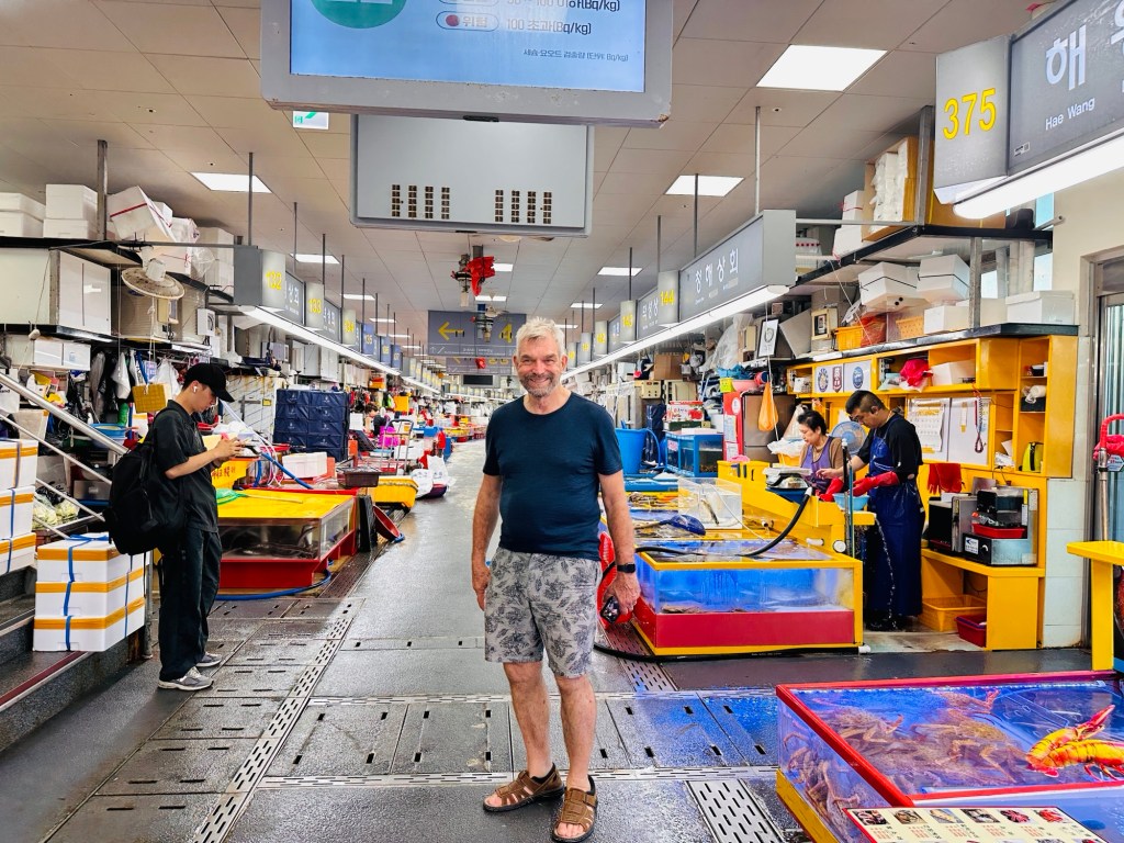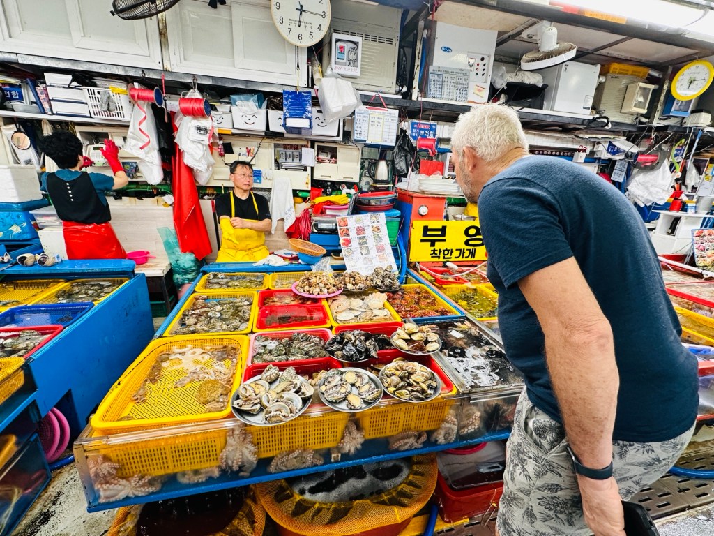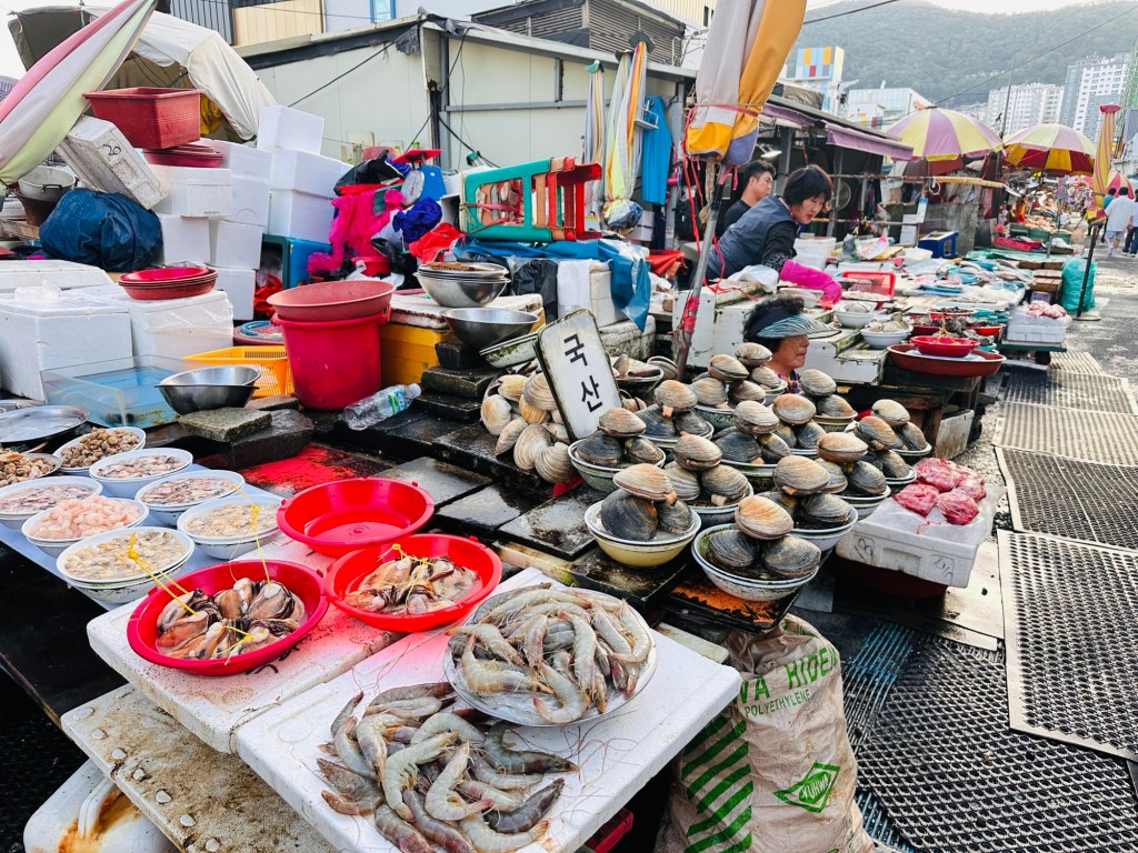 The Jagalchi Fish Market was an interesting stop -it is the largest fish market in Korea. There was an amazing variety of sea food, everything you could possibly imagine – from sea urchins to every fish possible to stingrays. As you imagine the smells associated with a fish market were quite pungent!