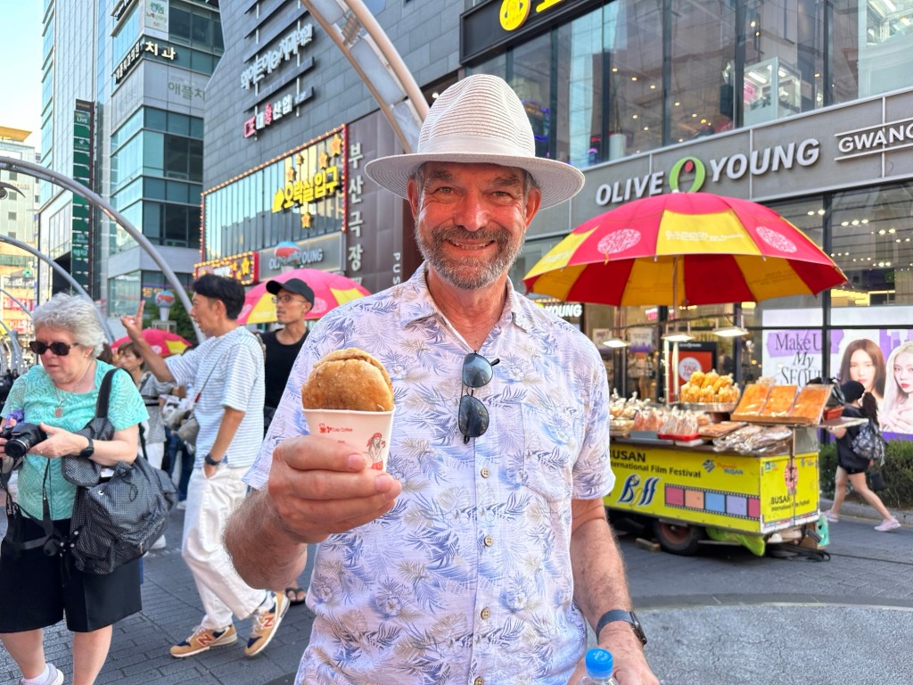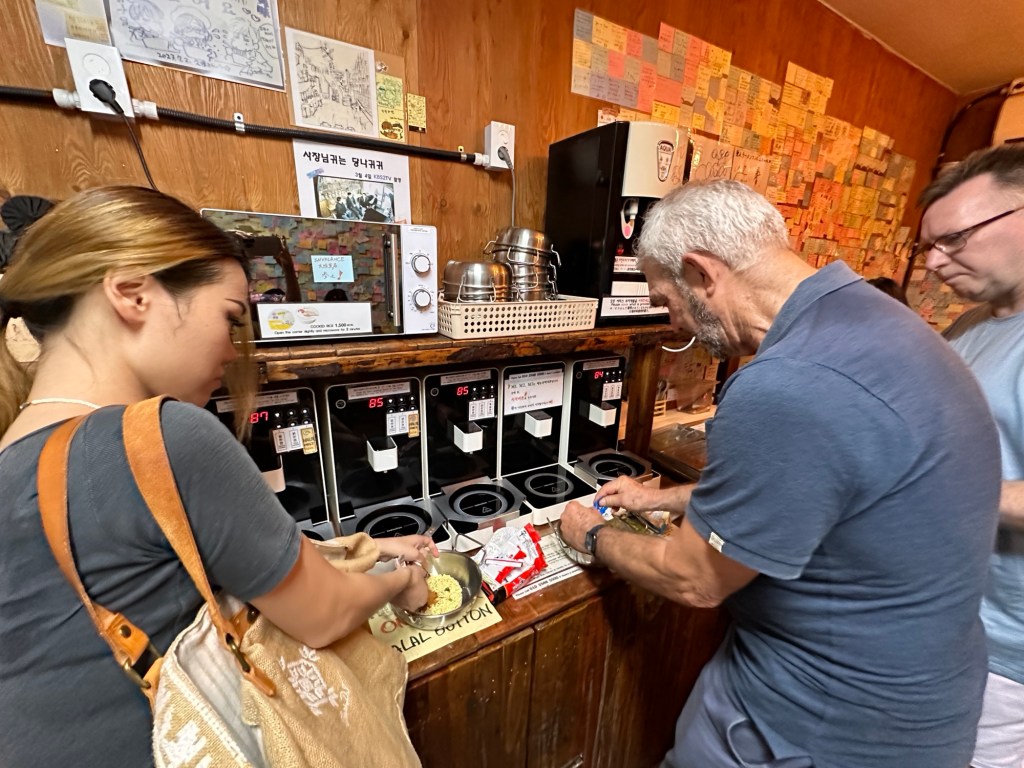 We were booked in to do a walking food tour of Seoul at 6.30pm. We headed off at 4.30 to make our way to the meeting point- had allowed some shopping/looking time, however we did get waylaid by a minor traffic accident in the narrow one way street on the way. The car was blocking the street and no one could get past – plenty of instructions from all the passer byes as how to move the damaged car, as well as the illegally parked cars just up ahead. Very entertaining! Of course Frank had his opinion as well!