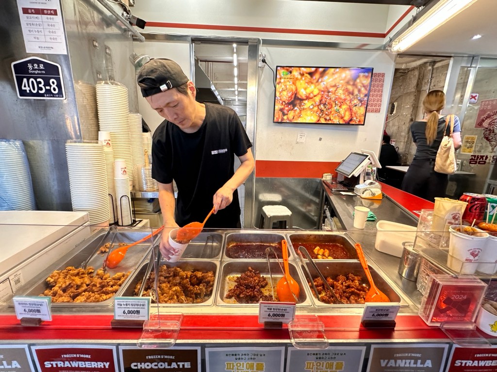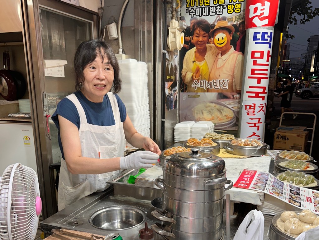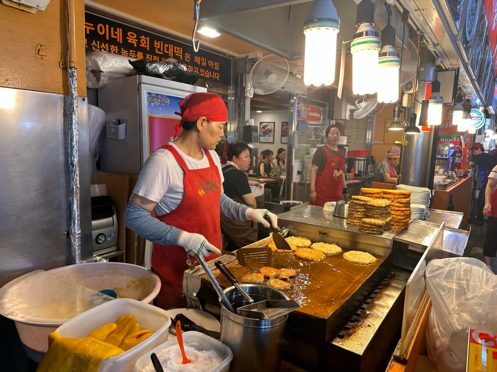 Our gorgeous young tour guide, Suha, met us at the specified time, and we headed into the Gwangchang Market – lucky we had come hungry! We spent an hour here sampling local Korean street food. Mung bean pancake was a favourite,( and among the locals), also the Pork, Shrimp and Kimchi dumplings. We saw the chef from Netflix Soul Food – Seoul episode. Also tried Garlic and Sweet chilly chicken with beer and soju, Tteokboki and Kimbap Walnut shaped bread, and Cheong gye cannel.