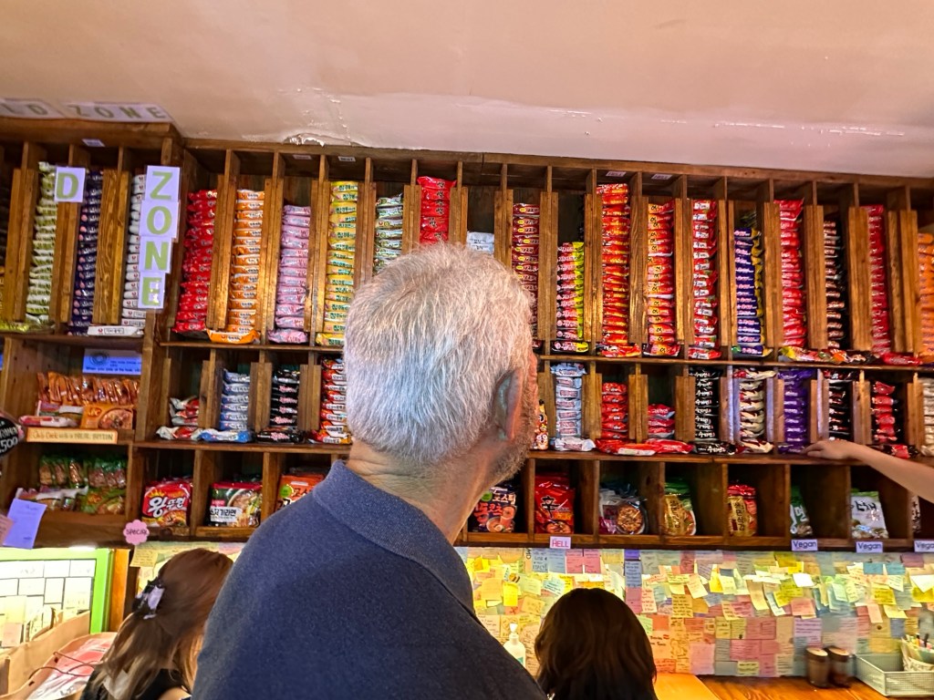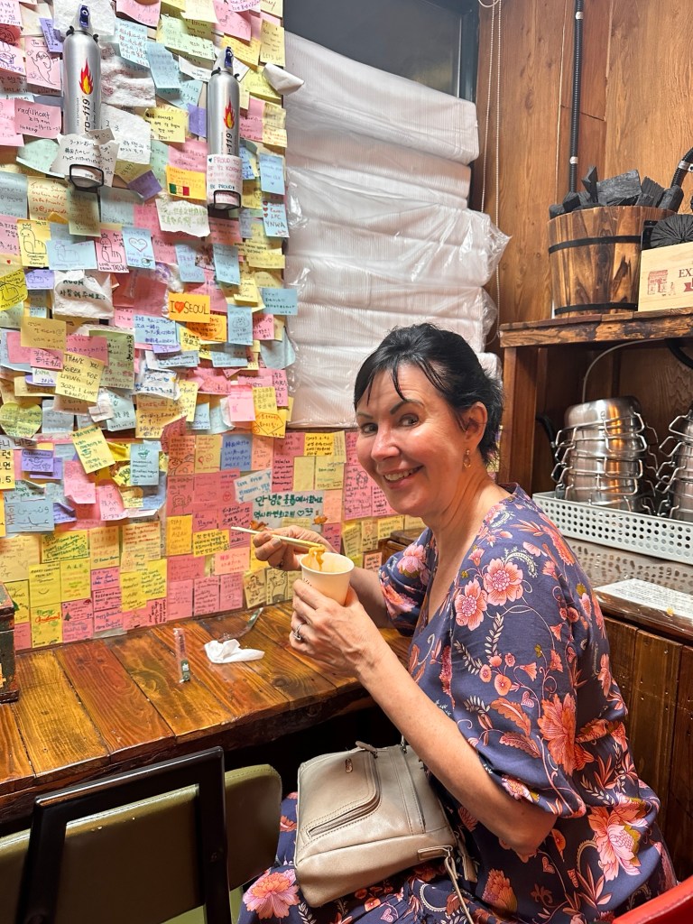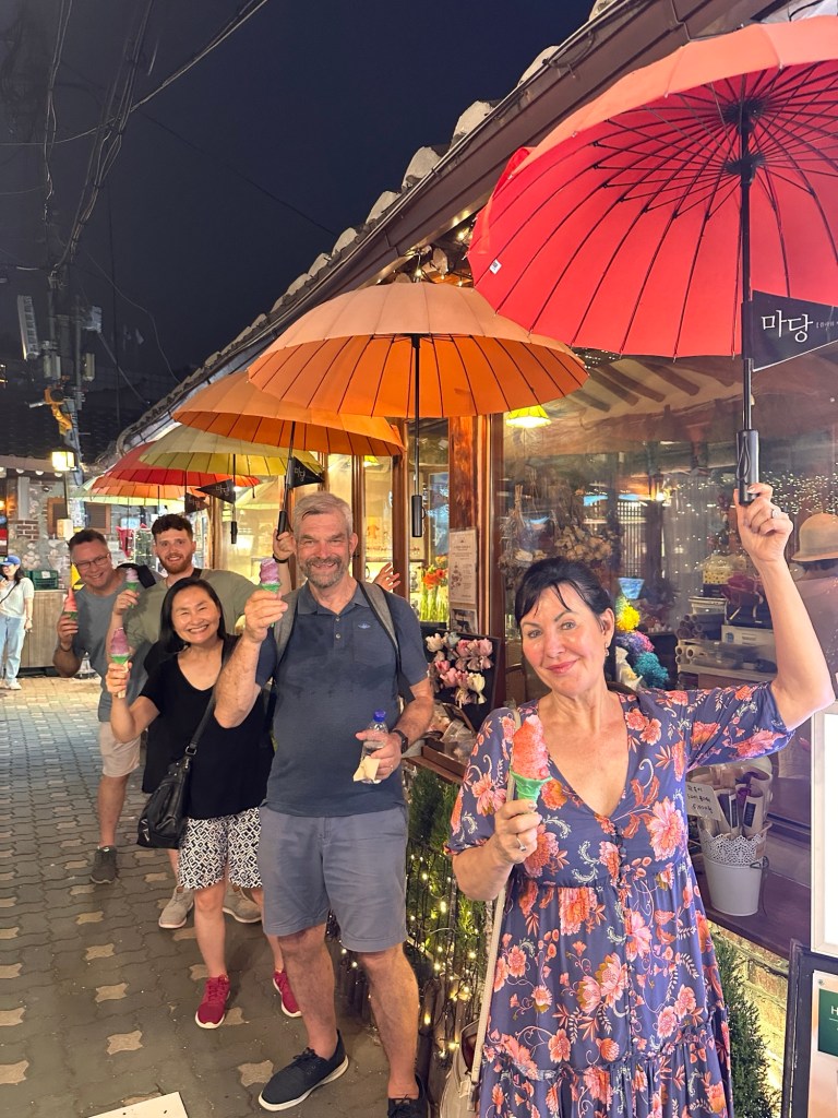 Onto Ikseon – which turned out to be the labyrinth of laneways opposite our hotel! No worries about repeating where we had been already.. there were hundreds of other laneways/eating places/shops we hadn’t seen. Some gorgeous little eating areas. Ikseon-dong is an upcoming, trendy hip area among Koreans. The harmony of alleys and Hanok houses exude beautiful charm. It’s a Hanok village that is yet to be as well-recognised as other Hanok villages. We slurped on Blue berry & Raspberry ice-cream while we viewed the gorgeous little eating areas. I just love this area.