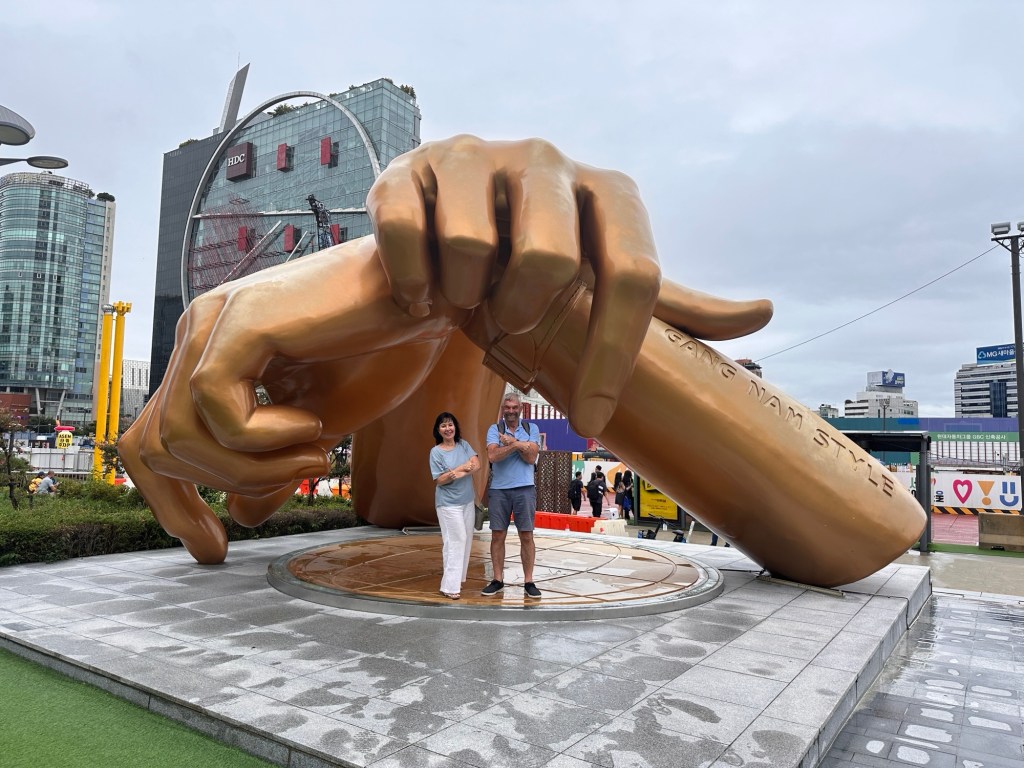 Our last day! Not the best weather – cloudy, rainy…and free time! The North Tower and the Lotte Tower excursions were ruled out, so our plan was to navigate our way with public transport to the Gangnam style statue (Gangnam actually refers to the area of Seoul south of the Han Rivet – the new modern upcoming area of Seoul). We had to go by train, then swap to bus, which all went to plan, and then we landed right outside the statue. The horse dance in Psy’s music video for ‘Gangnam Style’ has been iconified as a giant pair of bronze hands on a stage on the east side outside COEX Mall. Of course we had to have a photo!