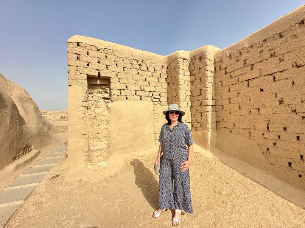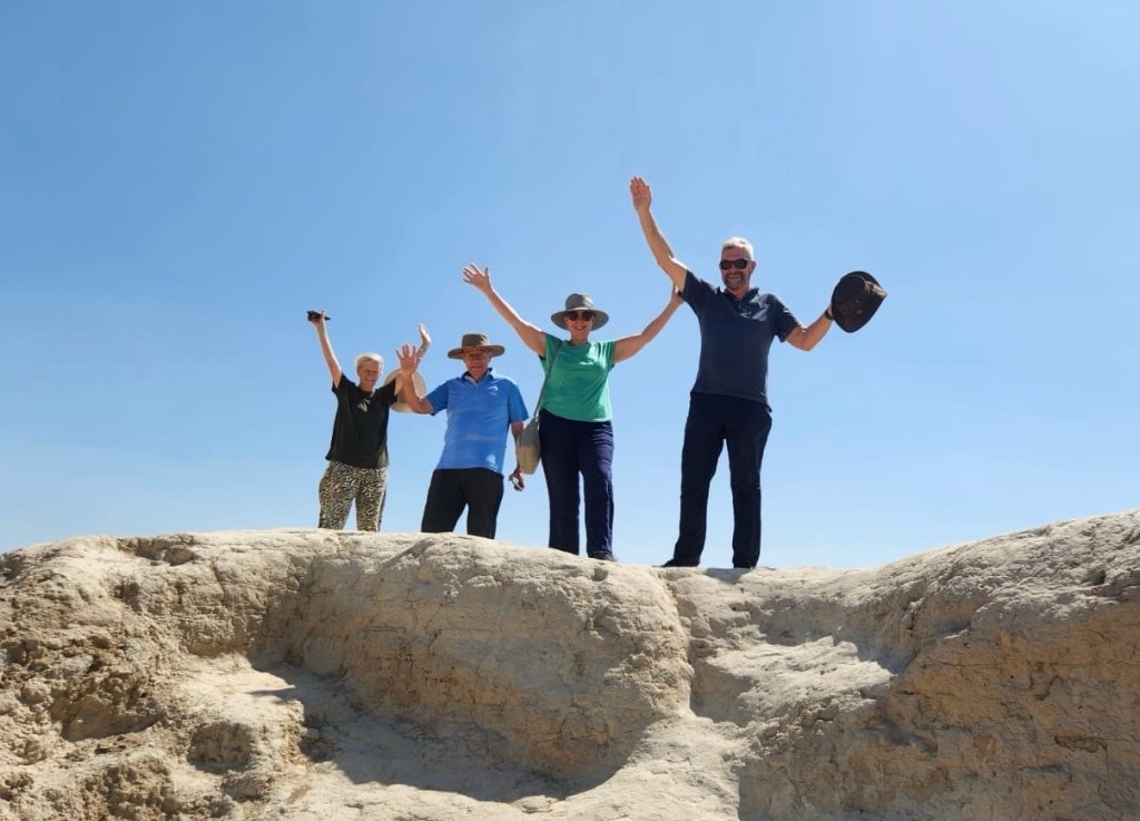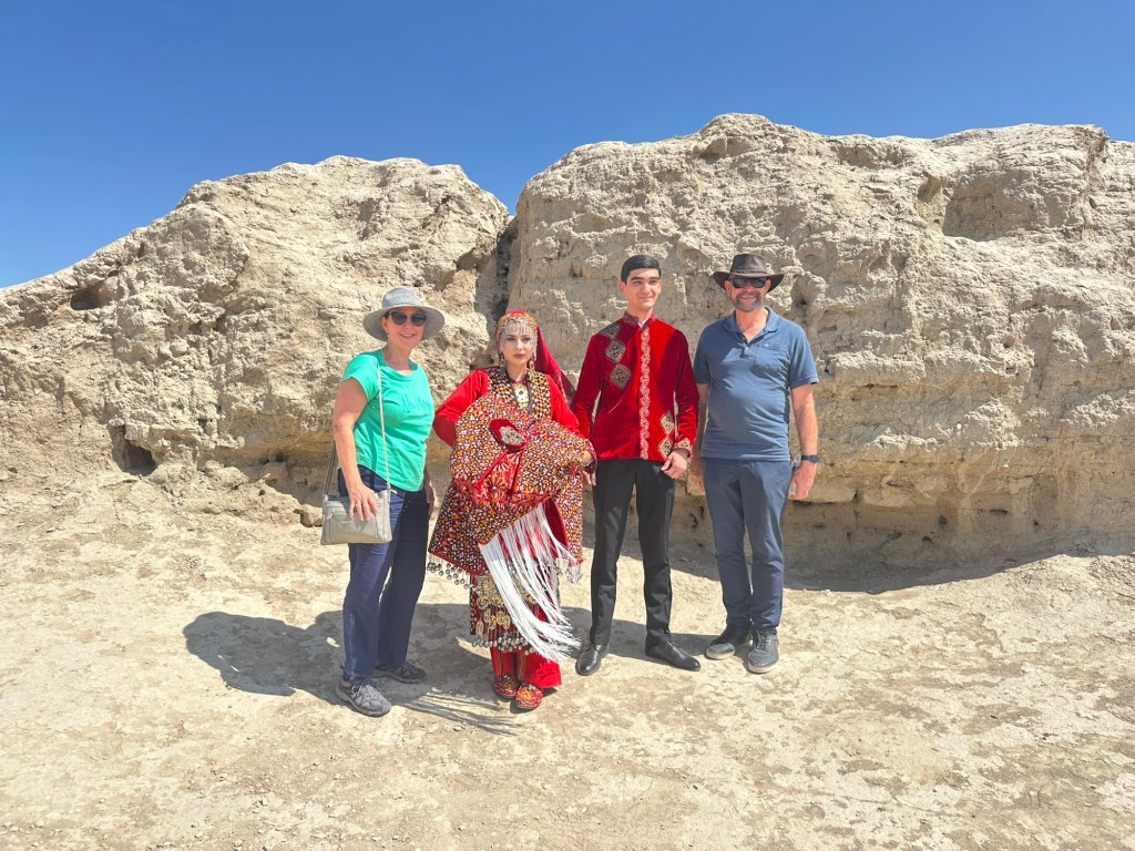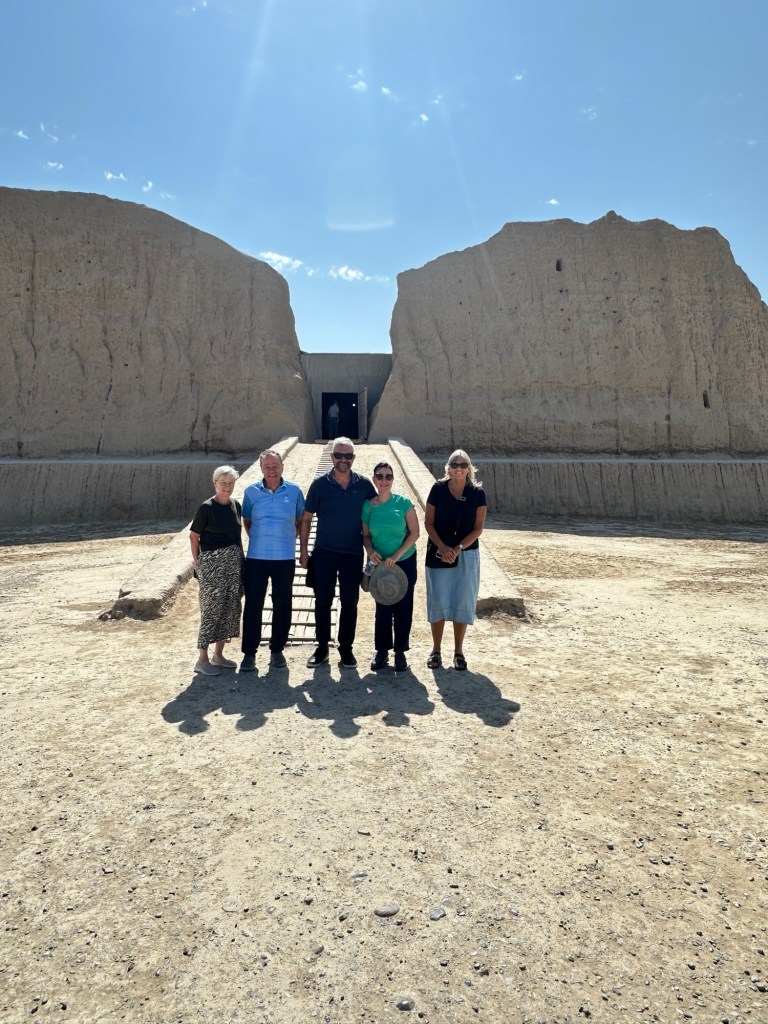 We stopped at the Girl’s Fortress or Gyzgala (8th Century), the Mausoleum of two Askhabs (7th and 15th Century), and the Mausoleum of Sultan Sanjar (12th Century), plus climbed to the top of the citadel Gawurgala, where we had spectacular views over the ancient lands of Merv. The fortress walls we could see were 17 metres high and 4 metres wide. We were treated to seeing a newly married couple having their wedding photos taken at the very top.