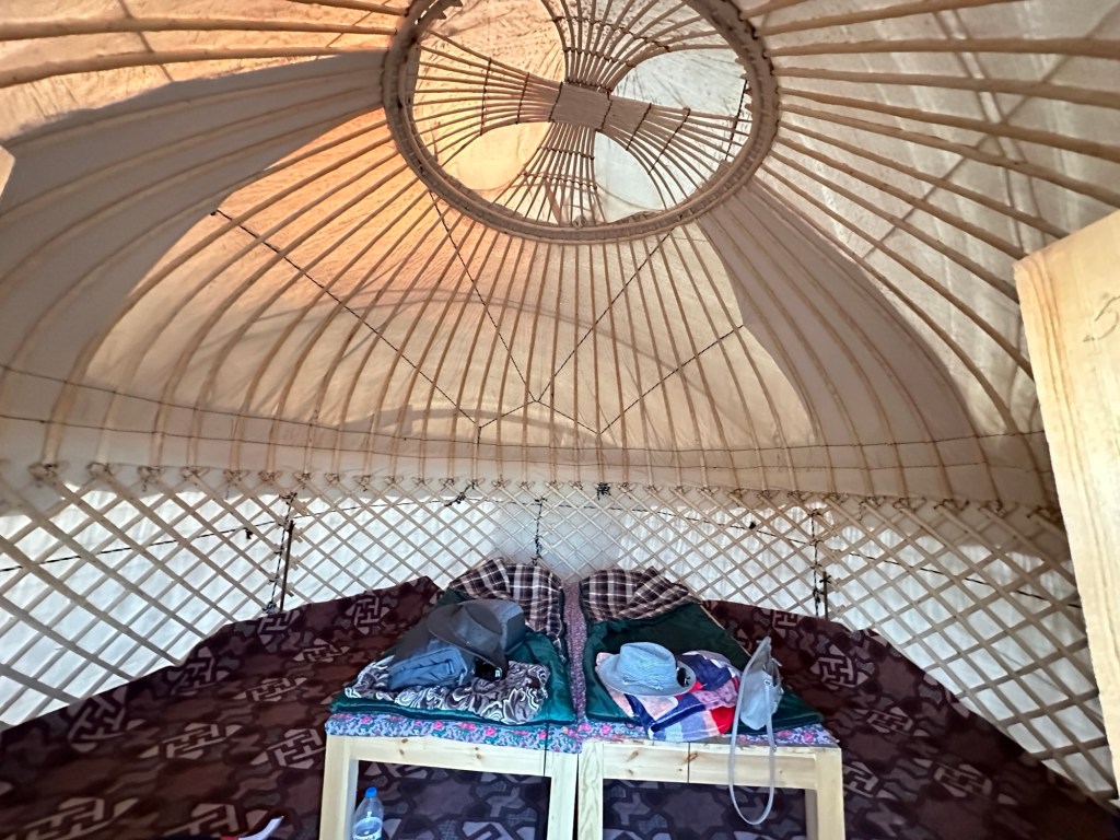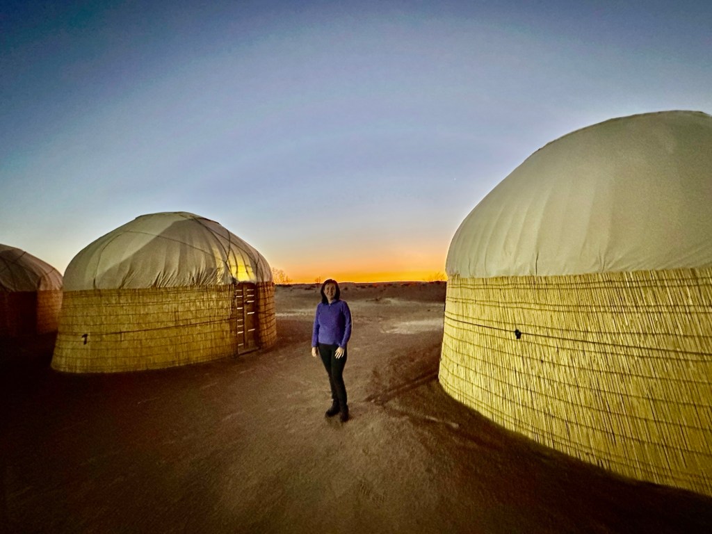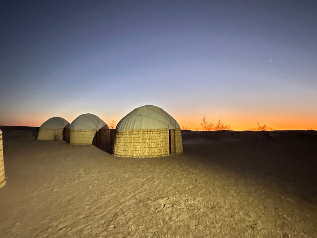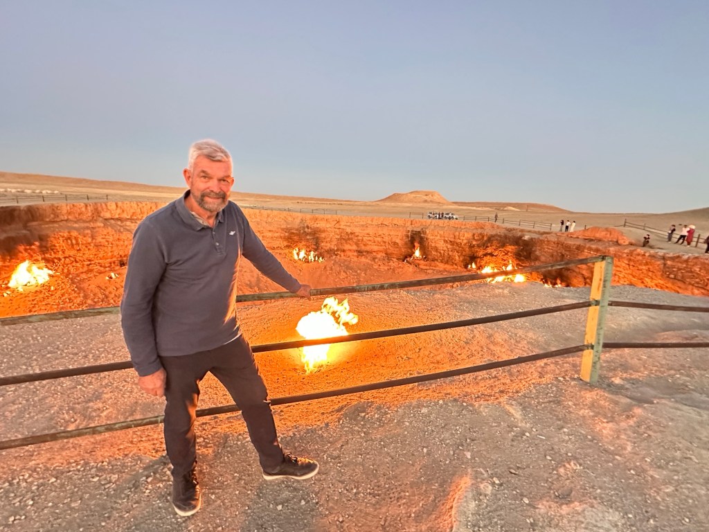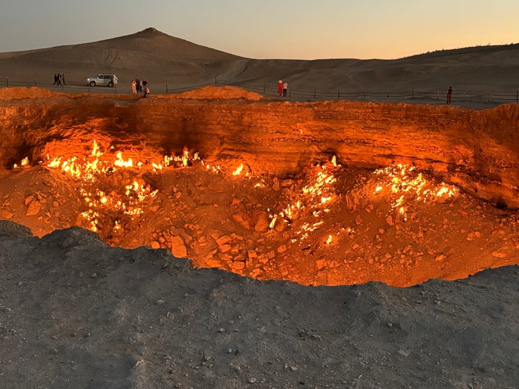 We dropped off our bags at the yurts, then went to look at the crater before and after sunset. Darvaza Crater is a manmade disaster from 1971, known locally as ‘The Gateway to Hell’, when a Soviet drilling rig collapsed into a natural gas field. The escaping gas was set alight to prevent it poisoning the local inhabitants, but instead of quickly burning out, it has continued to blaze ever since. It looked quite spectacular especially after sunset.