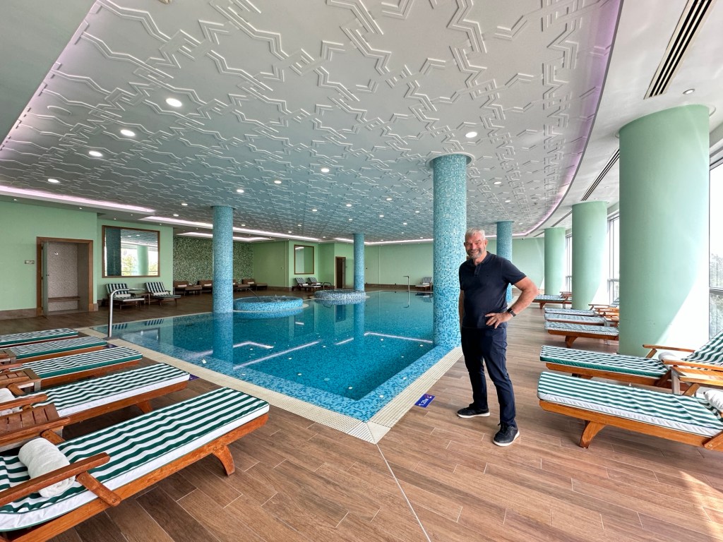 The outdoor pool glittered like a turquoise gem, and we couldn’t resist a dip. Blissful—except for the thumping soundtrack that made us wonder if we’d officially crossed into “too old for this” territory. We retreated inside for a quieter indulgence – a quick sauna, then a leisurely dip in one of the two serene indoor pools. Utterly rejuvenated, we were ready for whatever the afternoon promised.