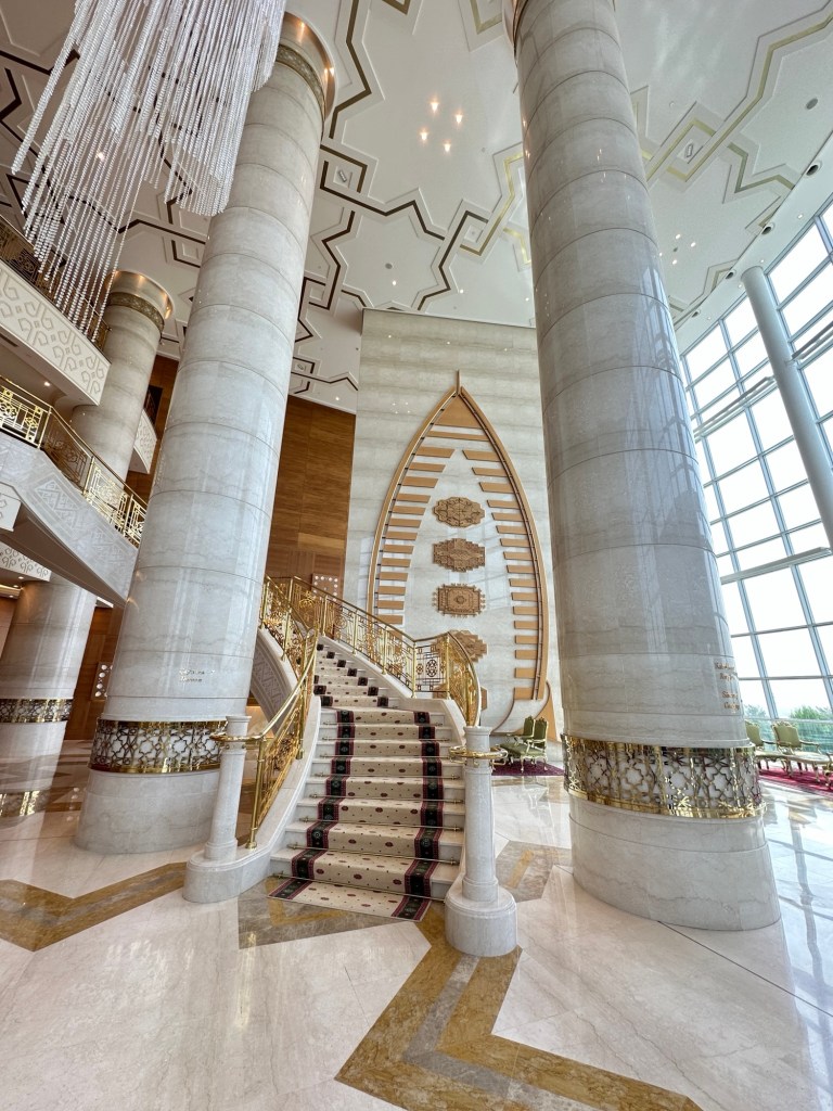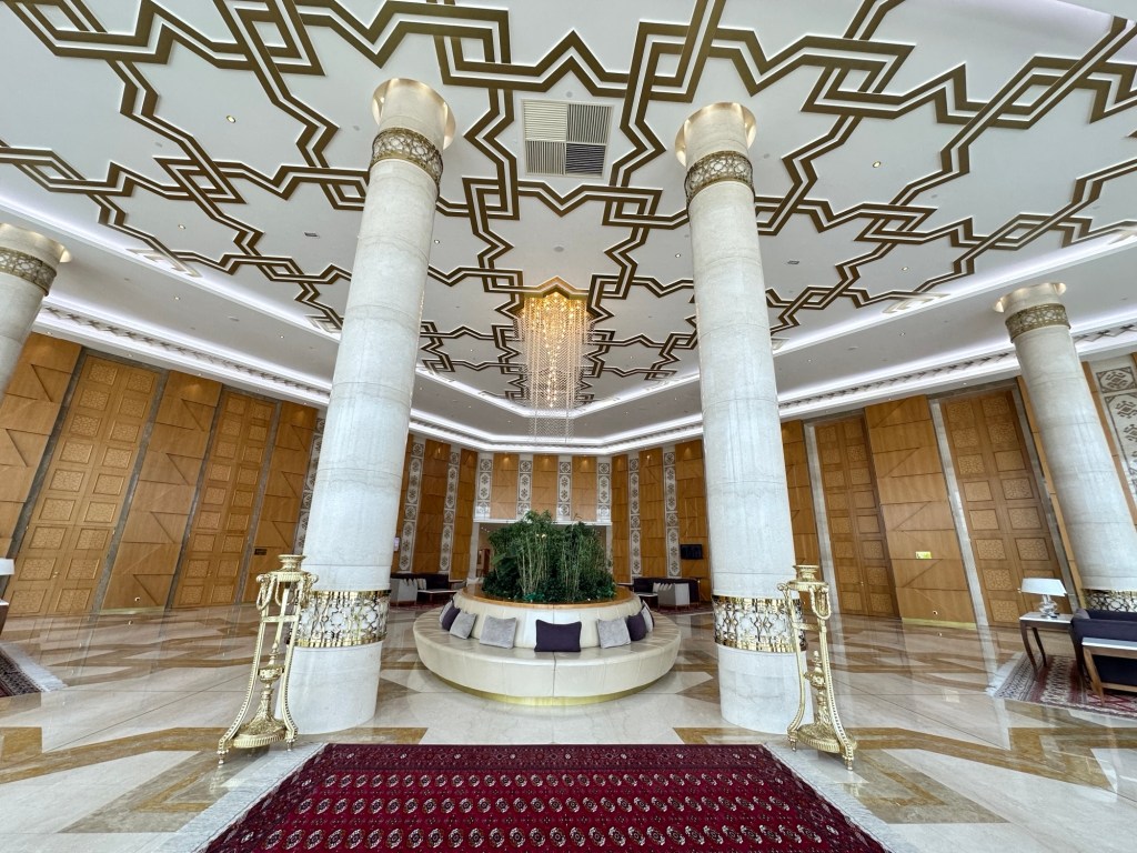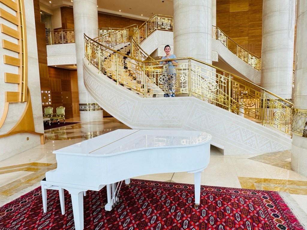 Then we rounded a bend and wow—the Yyldyz Hotel soared above the city like a crystal starship. Shaped like a futuristic pyramid, this five-star hotel reminded me of the Flame Towers in Baku, Azerbaijan This was our home for the next three nights. I couldn’t believe we were staying in one of Turkmenistan’s finest hotels. Perched in the foothills of the Kopetdag Mountains with sweeping views across the entire capital, the hotel’s gleaming profile is visible from anywhere in Ashgabat (Yyldyz means “Star” in Turkmen).